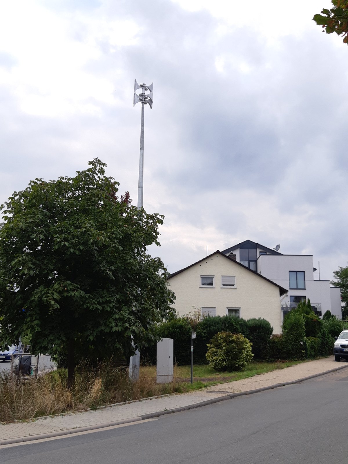 Den Anfang macht eine neue Sirene in Friedrichsdorf-Köppern (50°16'42.65"N, 8°38'55.84"E) als typische Mastmontage innerhalb einer städtichen Grünfläche im Schnittpunkt zweier Straßen. Bis vor gut 10 Jahren stand zwei Häuser weiter eine E 57 auf dem Dach des dortigen Hauses, das aber abgerissen und durch einen Neubau (auf dem Foto mit Wolkenhimmel im Hintergrund) ersetzt wurde. Es handelt sich um eine Ergatec EWS 6. Anhand einer mir zugespielten Handyaufnahme des ersten Tests kann ich immerhin sagen, dass sie einen ordentlichen Doppelton und normales Heulverhalten aufweist (nicht mehr so wie die ersten im Vordertaunus). Zum Vergleich noch das alte Haus und die Halterung offenbar für einen Feuermelder (auf dem Haus-Foto knapp über dem Dach des hinteren PKW erkennbar).