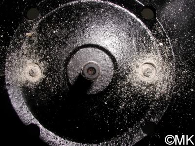 Nun ging es an den Motor: Dazu musste ich erst mal die Verschlussschrauben freilegen.Die waren mit einer zementähnlichen Masse versiegelt, die sich verdammt schwer herauskratzen ließ. Die darunter ligenden Muttern machten Probleme und konnten nicht gelöst werden. Also musste ich sie beide anbohren, um sie anschließend zu entnehmen. Dabei galt es höllisch aufzupassen, dass die Gewindestange (auf der die Muttern saßen) nicht beschädigt wurde. *schwitz*