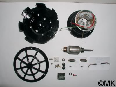 Die Halterungen für die Kohlebürsten habe ich auch noch ausgebaut, damit sie beim Lackieren später nicht im Weg sind. Die Feldspule zu entfernen war leider unmöglich, die sitzt zu fest im Sirenenfuß. Das folgende Foto zeigt die entnommenen Einzelteile des Motors.