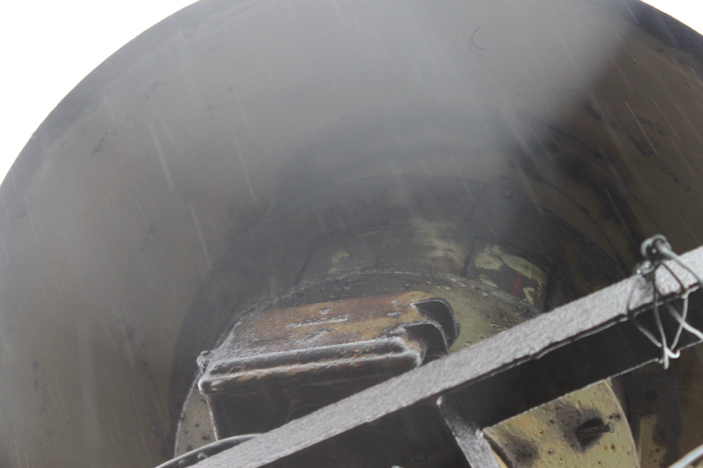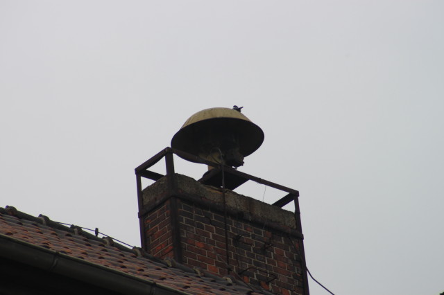 Hallo Leute, bei diesem Thema hat sich ewig nichts getan, nun aber gibt es was Neues. Euer Haumei hat endlich mal nen Besichtigungstermin gebacken gekriegt. Selbstverständlich beim zweitbesch... Wetter das man sich vorstellen kann, schön Regen mit schmierigem Dach und allem Pipapo. Deswegen auch nur ein Foto aus der Nähe, mir war es sicherer, alle vorhandenen Hände weitgehend zum Festhalten zu benutzen. Kurzer Bericht: Sie steht auf einem Schornstein ca 2 1/2m über der Kehle unterhalb des First, mit eingemauerten Tritteisen gehts nach oben. Die Winkel- und Flachstahlverstärkungen des Schornsteins sind solide genug, dass man sich anseilen kann. Nach Demontage des Daches könnte man sie mit mindestens 3 Mann in die Dachluke bugsieren. Das Dach selbst müsste man abseilen. Idealfall - FW-Übung mit Hubbühne. Der Rotor war leicht fest, ist nach Drehversuch wieder frei, geht aber schwer duch einen Haufen Dreck darunter, ich habe ihn wieder in die "Ports verschlossen"-Stellung gedreht. Fabrikschild ist vorhanden, die eingeschlagenen Zeichen sind erkennbar aber Foto - s.oben, Sicherheit geht vor, Wohlfühlen ist was Anderes. Ich habe mich dann wieder in die Luke gehangelt (Affenarmen und Blitzableiter sei Dank) und den Schützenkasten gesucht - nix. Wir haben das Kabel bis in den Keller verfolgt, an der Hauptverteilung dann ein Eigenbau-Auslöse-Schützenkasten. Die Gute diente zumindest nach dem Krieg nur dazu, im Brand- oder Havariefall auch dem Letzten auf dem Firmengelände klar zu machen, dass man sich zum Sammelplatz begeben sollte, dazu reichte dann die Bastelei auf dem Foto.
