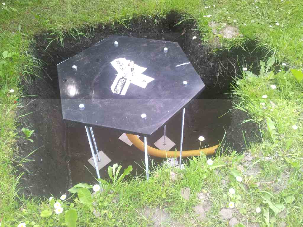 mittlerweile ist viel Zeit vergangen und es hat sich viel getan. Das Loch hab ich nach und nach auf eine Tiefe von fast 1 Meter gegraben. Dann hab ich mir von der Grundplatte eine Schablone aus Kunststoff gemacht und die Gewindestangen sowie ein Kabelrohr daran befestigt. Das alles ins Loch, mit Beton gefüllt und fertig ist das Fundament.