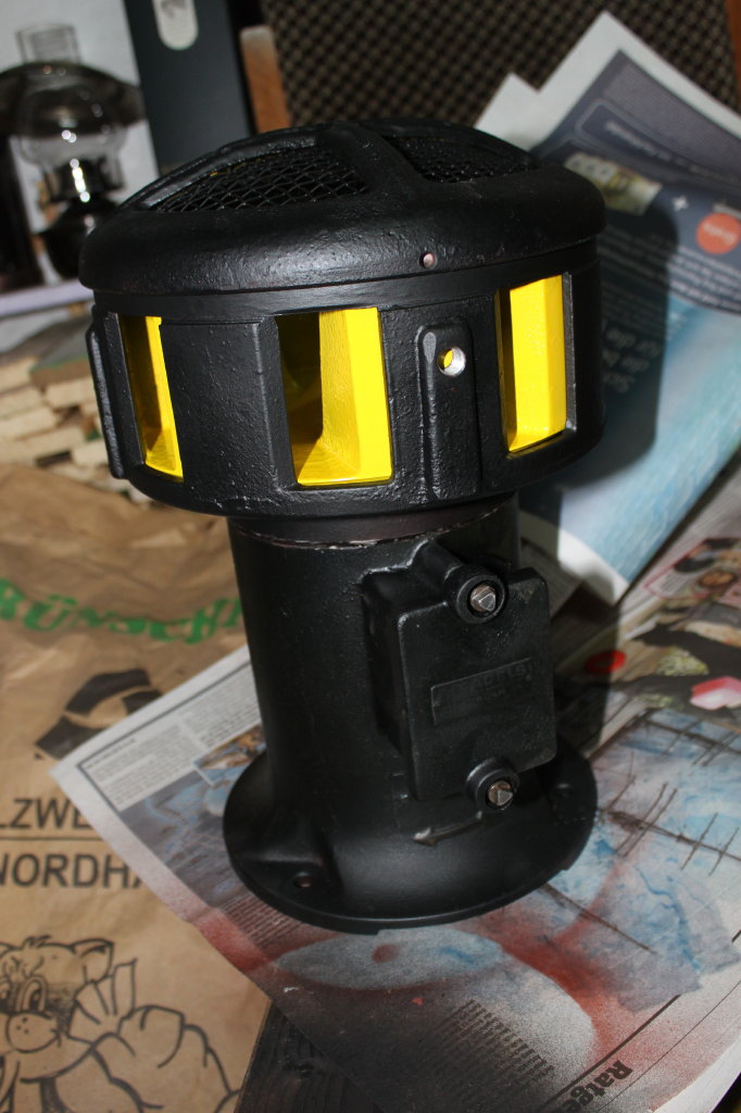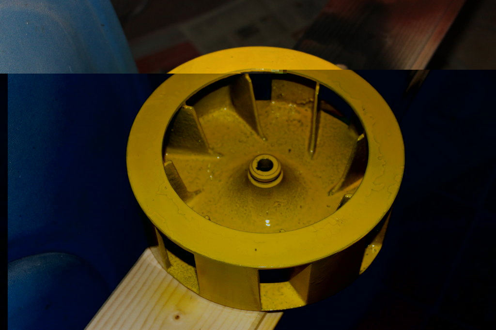 Wäre ich nicht auf den Lagererneuerungstrip gekommen, wäre sie schon fertig. So bleibt es erstmal wieder bei einer Stellprobe, das Gelb beißt ganz schön im Auge. Der Konstrukteur muss sich einige Gedanken um die Luftströmung gemacht haben, die Kanten der Statorports sind in Drehrichtung angeschrägt, während sie entgegen glatt sind. Ich werde hier beim ersten Test mal spaßeshalber einen Versuch machen. Zuerst messe ich die Lautstärke in normaler Drehrichtung, dann lasse ich sie rückwärts laufen. Mal schauen, ob und wieviel sie leiser ist.