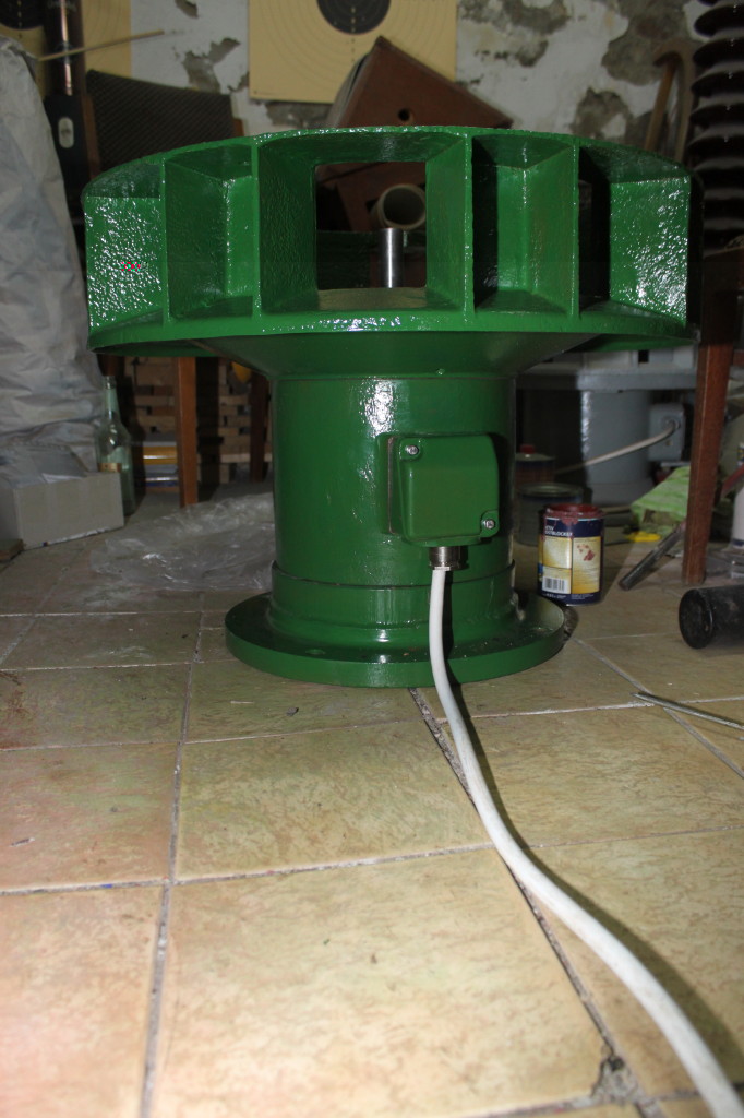Mein Monsterchen ist fertig! Heute kam eine Schachtel Schrauben und ich war nicht mehr zu bremsen. Den Stator auf den Kopf gedreht, Motorgehäuse drauf, Fuß drauf, Schrauben rein, festziehen. Dann das Ganze runter und richtig herum hinstellen, "toten" Klemmkastendeckel, "scharfen" Klemmkasten und Kabel montieren. Als Nächstes Motorwelle mit oberem Lager in den Stator. Reintüdeln der Motorwelle ins Gehäuse, Stator ausrichten (Kabelnut über "toten" Klemmkasten), Schrauben rein, festziehen. Ein paar Schläge unter Drehen auf die Motorwelle, das untere Lager sitzt. Obere Lagerabdeckung montieren, Probelauf, nanu?! Die Drehrichtung passt schon wieder nicht, gnrrr!!! Aber klar, man sollte den umgepolten Stecker schon vorher zurückdrehen. Drehrichtung passt, HSG auf "Entwarnung" aufgezogen - eine Minute Lagereinlaufen. Passfeder in die Wellennut und Rotor drauf. Der Krepel schleift irgendwo, sowas hasse ich. Nachdem ich alle erkennbaren Überständen am Stator mit Schleifpapier zu Leibe gerückt bin blieb natürlich noch eine Stelle die nicht zu finden war. Hat aber der heiße Probelauf