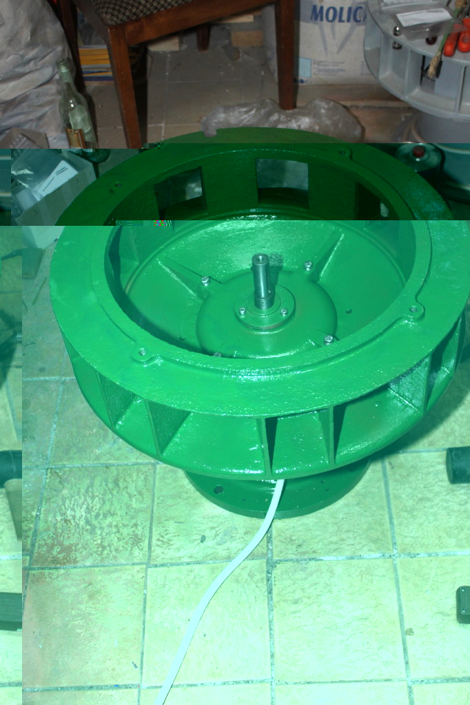 Mein Monsterchen ist fertig! Heute kam eine Schachtel Schrauben und ich war nicht mehr zu bremsen. Den Stator auf den Kopf gedreht, Motorgehäuse drauf, Fuß drauf, Schrauben rein, festziehen. Dann das Ganze runter und richtig herum hinstellen, "toten" Klemmkastendeckel, "scharfen" Klemmkasten und Kabel montieren. Als Nächstes Motorwelle mit oberem Lager in den Stator. Reintüdeln der Motorwelle ins Gehäuse, Stator ausrichten (Kabelnut über "toten" Klemmkasten), Schrauben rein, festziehen. Ein paar Schläge unter Drehen auf die Motorwelle, das untere Lager sitzt. Obere Lagerabdeckung montieren, Probelauf, nanu?! Die Drehrichtung passt schon wieder nicht, gnrrr!!! Aber klar, man sollte den umgepolten Stecker schon vorher zurückdrehen. Drehrichtung passt, HSG auf "Entwarnung" aufgezogen - eine Minute Lagereinlaufen. Passfeder in die Wellennut und Rotor drauf. Der Krepel schleift irgendwo, sowas hasse ich. Nachdem ich alle erkennbaren Überständen am Stator mit Schleifpapier zu Leibe gerückt bin blieb natürlich noch eine Stelle die nicht zu finden war. Hat aber der heiße Probelauf