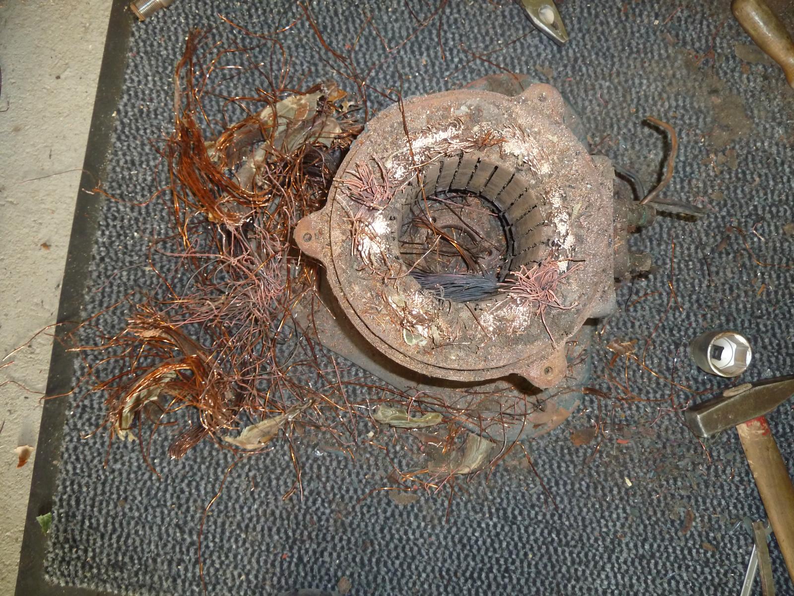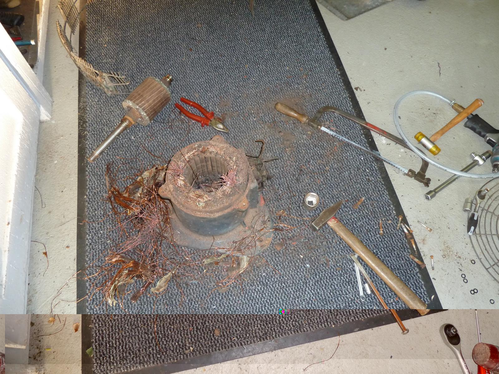Der hier zersägte Elektror-Motor hatte sein Ableben bereits durch Rauchzeichen angekündigt. Sirenator will versuchen, den verbrannten Motor ganz aus dem Gehäuse zu schlagen, dass dann in einem großen Ofen auf 300°C erhitzt und mit einem neuen Motorkern versehen werden soll. Lasset uns der Dinge harren, die da kommen mögen!
