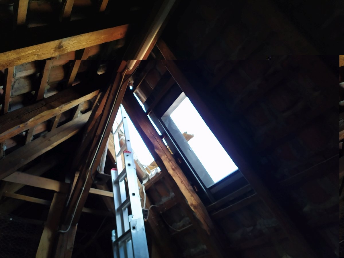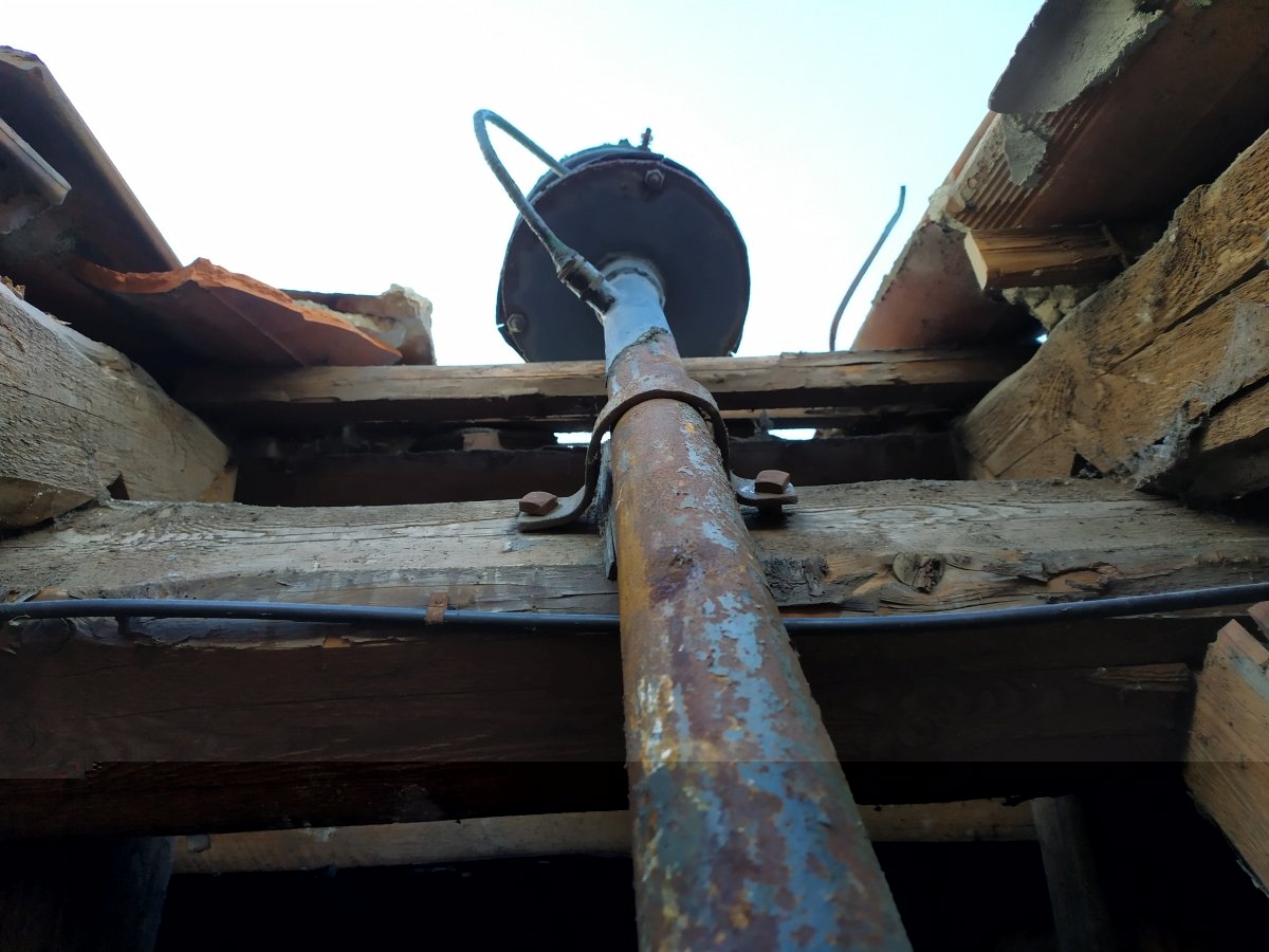 Das Wartungsbrett unterhalb der Sirene wäre nichtmal mehr als Brennholz zu gebrauchen gewesen, keine Chance da drauf zu steigen. Da das Gebäude aber eh abgrissen wird, konnten wird das Dach großzügig öffnen. Dabei hat mir doch tatsächlich eine Wespe oder Hornisse in den Finger gestochen. Die hatte vermutlich im dort unterm Dach überwintert oder einen Nistplatz gesucht. Aber keine Zeit zum jammern, muss ja weitergehen.