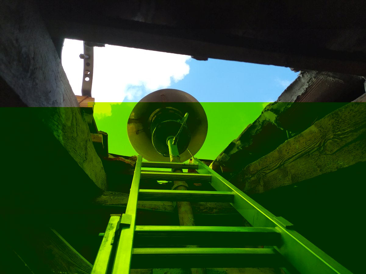 Das Wartungsbrett unterhalb der Sirene wäre nichtmal mehr als Brennholz zu gebrauchen gewesen, keine Chance da drauf zu steigen. Da das Gebäude aber eh abgrissen wird, konnten wird das Dach großzügig öffnen. Dabei hat mir doch tatsächlich eine Wespe oder Hornisse in den Finger gestochen. Die hatte vermutlich im dort unterm Dach überwintert oder einen Nistplatz gesucht. Aber keine Zeit zum jammern, muss ja weitergehen.