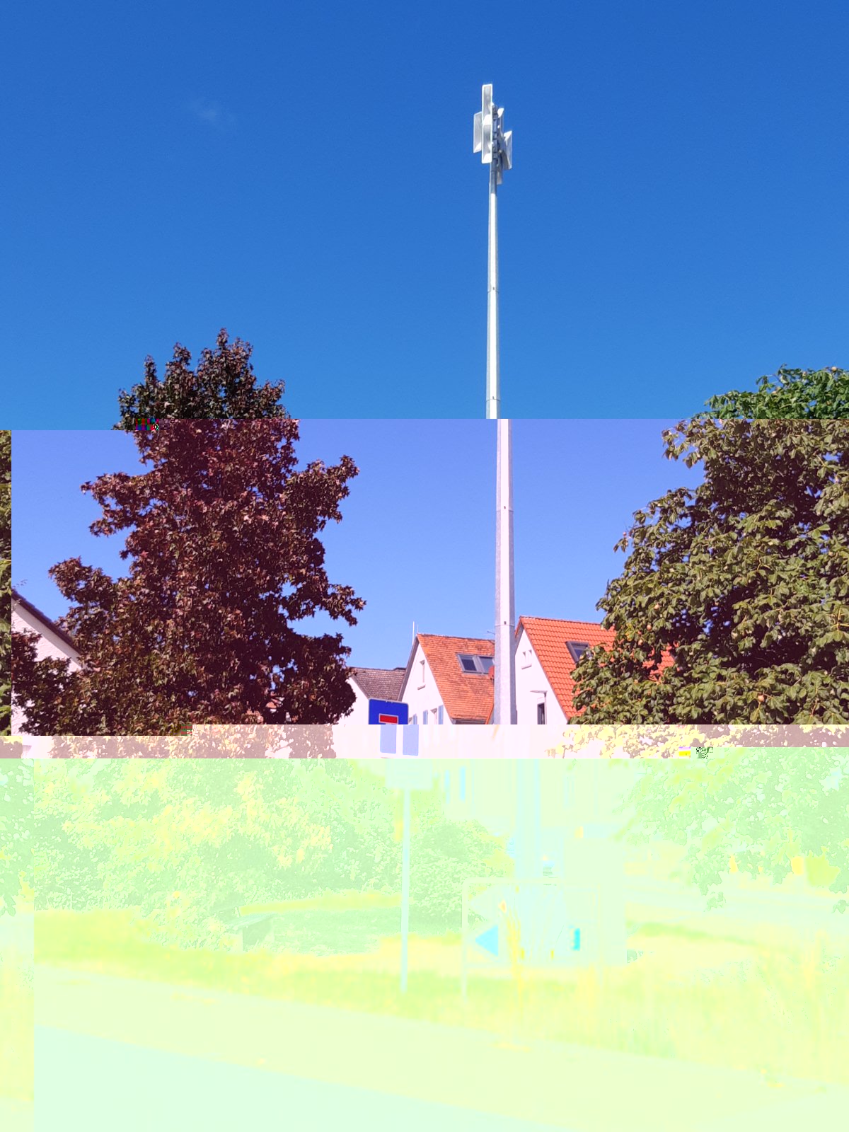 Den Anfang macht eine neue Sirene in Friedrichsdorf-Köppern (50°16'42.65"N, 8°38'55.84"E) als typische Mastmontage innerhalb einer städtichen Grünfläche im Schnittpunkt zweier Straßen. Bis vor gut 10 Jahren stand zwei Häuser weiter eine E 57 auf dem Dach des dortigen Hauses, das aber abgerissen und durch einen Neubau (auf dem Foto mit Wolkenhimmel im Hintergrund) ersetzt wurde. Es handelt sich um eine Ergatec EWS 6. Anhand einer mir zugespielten Handyaufnahme des ersten Tests kann ich immerhin sagen, dass sie einen ordentlichen Doppelton und normales Heulverhalten aufweist (nicht mehr so wie die ersten im Vordertaunus). Zum Vergleich noch das alte Haus und die Halterung offenbar für einen Feuermelder (auf dem Haus-Foto knapp über dem Dach des hinteren PKW erkennbar).