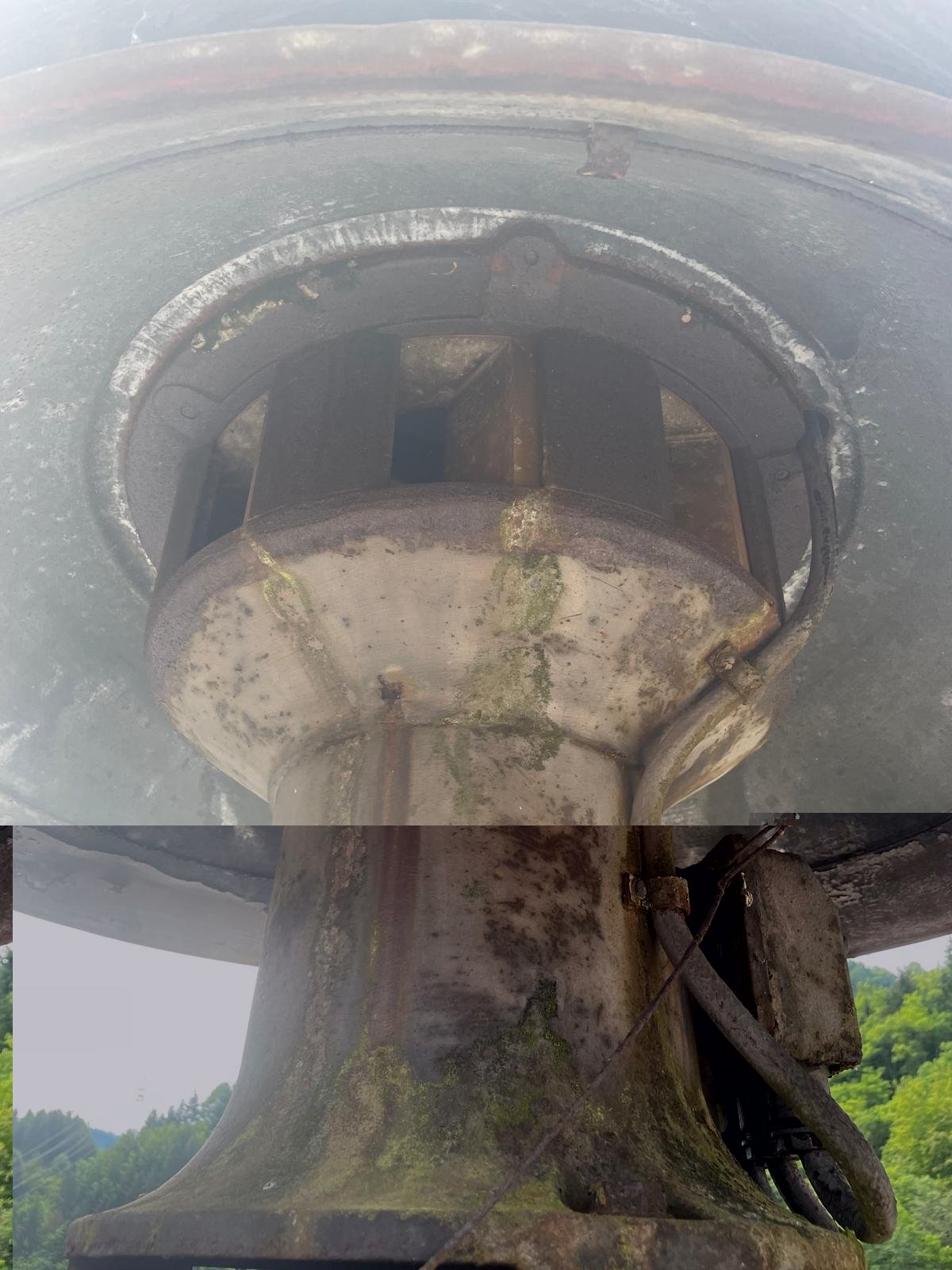 Nach diesem schönen Fund ging es schon ans Gerüstaufbauen, was bei schwülem Wetter sehr schweißtreibend war. Als das Gerüst stand, wurden erst die drei Schutzdächer, dann der Tieftöner und zu guterletzt der Hochtöner demontiert und an einem Strick abgelassen. Nach dem alle Teile vom Mast geholt waren, durften wir diese und die Gerüstteile natürlich wieder drei Stockwerke durch das Treppenhaus schleppen. Zum schluss wurde noch die Schaltanlage demontiert und etwas im Lostplace herumgestöbert.