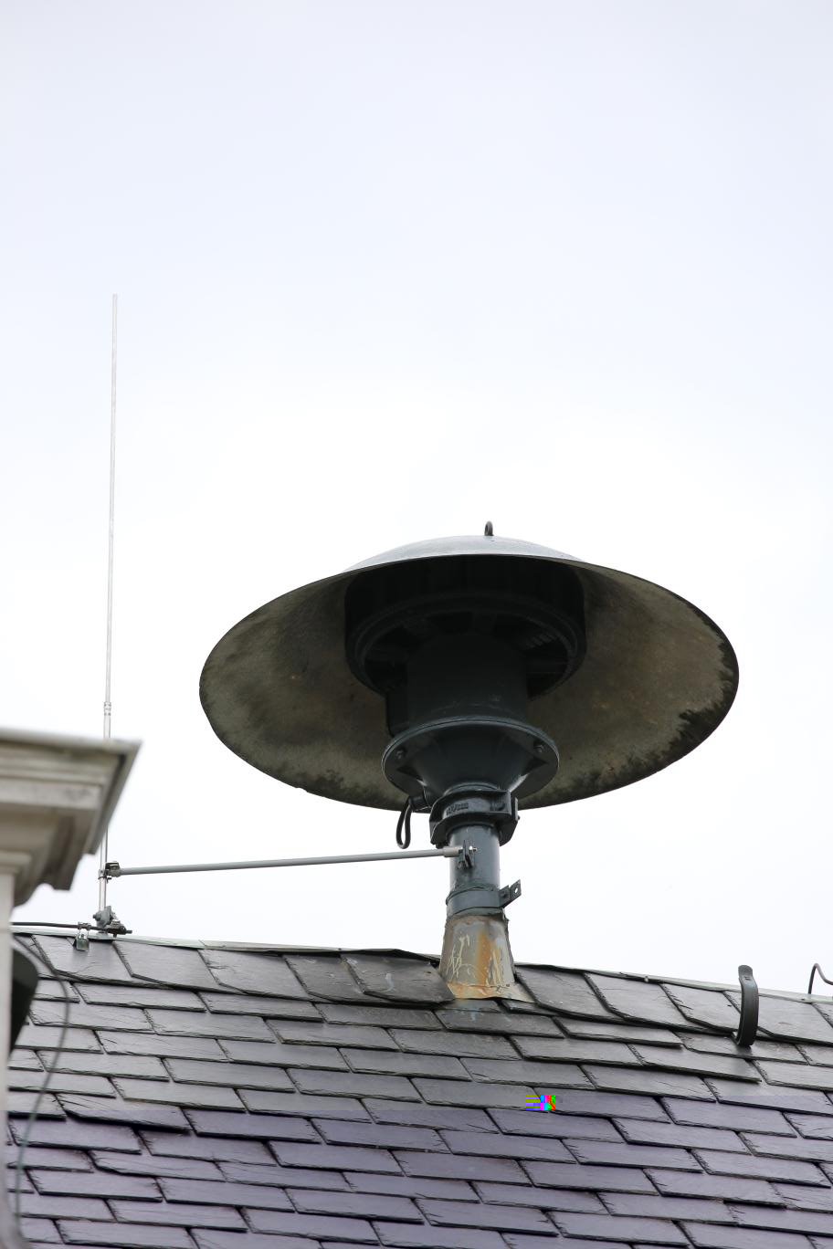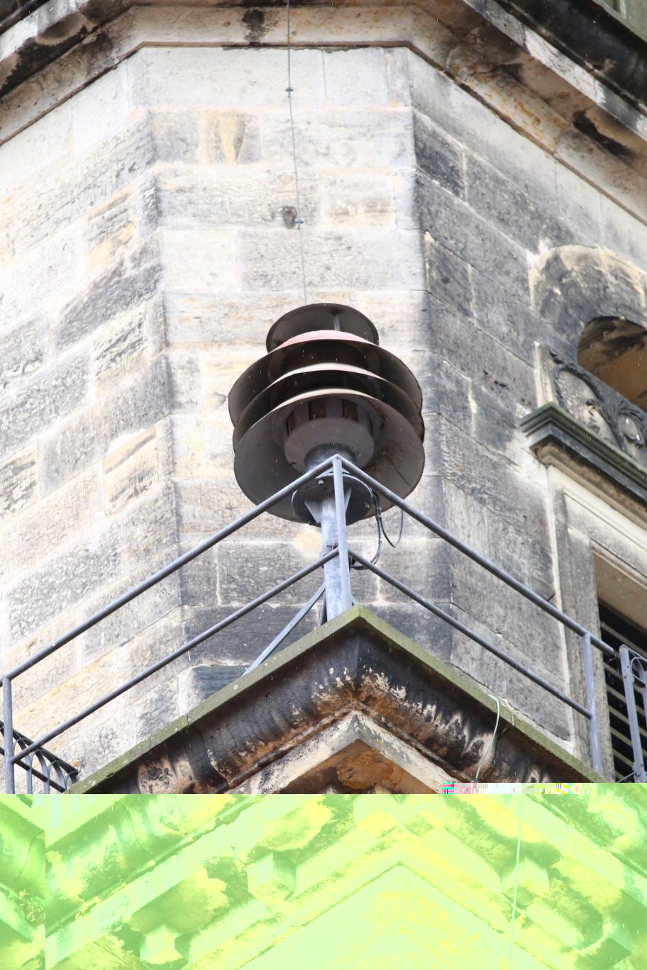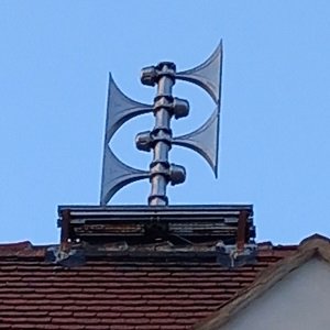 Interessante Sirene mit nachgebauten Dächern und zusätzlichem Schutzdach für den Motor des Tieftonteils. Montage auf Kirchturm. Stand September 2021 nicht mehr vorhanden.