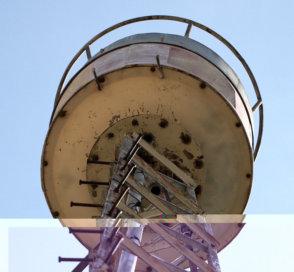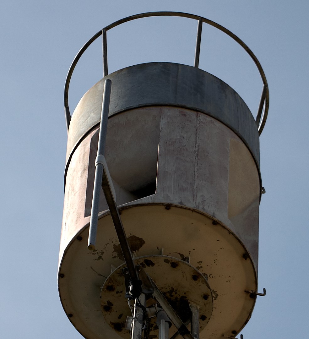 Am Mast ist zwar schon einiges an Farbe abgeplatzt, jedoch ist da noch die Zinkschicht darunter. Und diese ist auch noch fast vollständig heil. Nur am Druckluftbehälter ist schon etwas Rost zu sehen. Der Mast dürfte also noch einige Zeit durchhalten!Sie steht noch, aber das arme Ding gammelt leider so langsam vor sich hin.