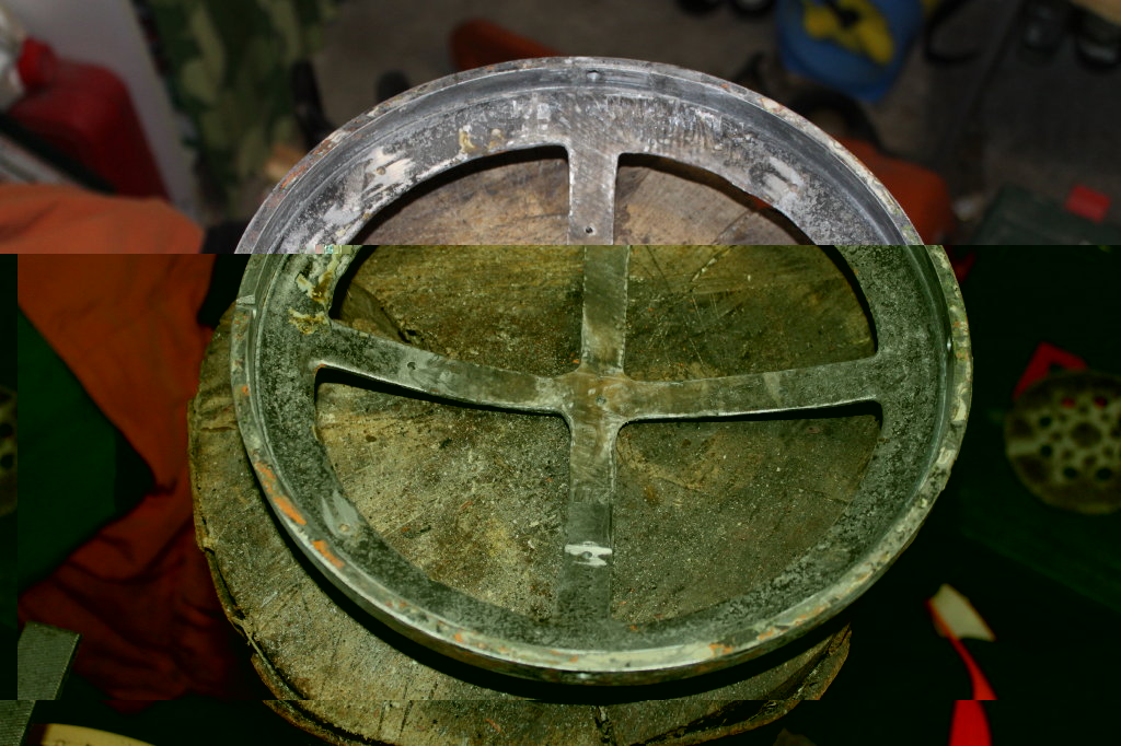 Heute sind wieder einige Sachen passiert, die Uraltniete sind raus, der Deckel ist geklebt und ich hab entgegen meiner früheren Einstellung doch erstmal den Stator vom oberen Lagerschild abgebaut. Nach dem Lösen der 4 Schlitzschrauben, nur die Letzte hat wie immer Probleme gemacht, saß er zunächst bombenfest. Als ich nach einer WD40-Einweichphase den Abzieher gaaaaanz vorsichtig angezogen hab kam er mit einem Knall und mir rutschte das Herz in die Hose. Aber es war gotteseidank nur der Uraltrostschmadder, der Stator hats überlebt. Jetzt nach der Reinigung kann ich ihn jederzeit wieder unterstellen oder die Gewindebohrungen doch an meiner Bohrmaschine vertiefen. Eine durchwachsene Überraschung sind die anscheinend vernieteten Stehbolzen des oberen Lagerschilds. Die bohre ich nun nicht auch noch aus, zumal die Sache prima hält. Muss ich nur schauen, wie ich so ein paar Rostbrocken von den Motorstatorblechen gekratzt kriege, die haben mir die Riefen in die Motorwelle gemacht.
