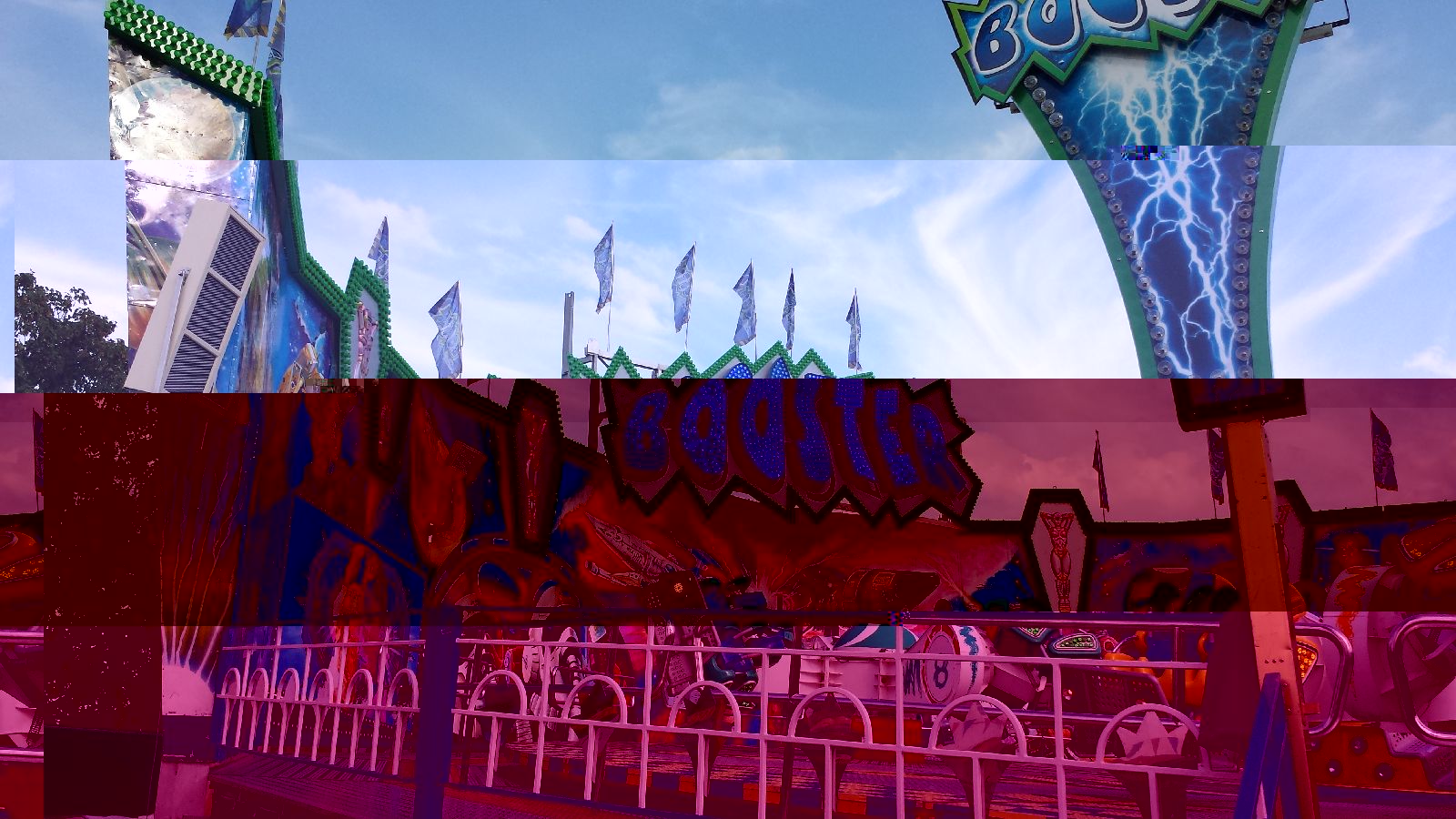 Hier das Fahrgeschäft Booster: Dann wenn man auf der linken Seite dran vorbei geht kommt man dahinter und man sieht: Die Fotos bringen es nun nicht ganz rüber aber die Wand überragt die Sirene um knapp einen Meter. Zudem noch der nach unten gerichtete Schall...
