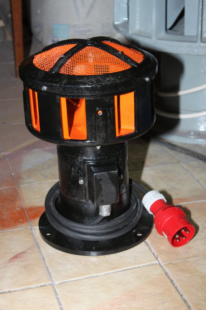 Jetzt kam der elektrische Teil. Ist ja im Groben allgemein bekannt wie man Drehstromsirenen anklemmt. Nur für den Schutzleiter hab ich mangels befriedigender Anklemmöglichkeit ein Stück Gewindestab M4 mit 2 auf einer Seite bei 8mm gekonterten Muttern versehen und in eine Klemmbrettbefestigungsbohrung anstelle der Originalschraube gedreht. Die genaue Länge hab ich nicht gemessen, immer nur alles passend gemacht ;-) Dann hab ich mit Respektabstand zu den 400V-Anschlüssen der Mororwicklung mit 2 weiteren Muttern die Öse für den Schutzleiter befestigt. Dann den Rest angeklemmt, Deckel mit neuer Durchführung drauf und Test. Dreht bis an die Grenze des ohne Gehörschutz erträglichen Bereichs gut hoch, macht gut Rabatz, nur eben der Lauf... Video gibts wahrscheinlich morgen, heute wollte ich meine Nachbarn nicht mehr belästigen.