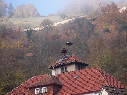 Und hier in einem Odenwalddörfchen am Feuerwehrhaus. Hier hat man die Sirene in einer Art Glockenreiter untergebracht. Ca. 100 m entfernt steht auf einem Hausdach eine E 57, offenbar diente diese hier also nur zur Alarmierung der Feuerwehr…
