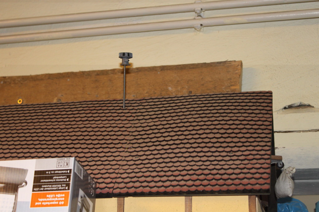 Mein Clubvorsitzender findets auch geil ;-) Die wird definitiv aufgestellt, von einem Soundmodul fing er ganz alleine an. Eine Dachidee hat er auch geliefert, da schreibe ich dann mehr, wenns konkret wird. Hie noch ein Spaßfoto, die Kleine hat ihre erste Dachluft geschnuppert... Da unsere Anlage gerade senkrecht steht, hab ich sie pro Forma mittels eines Nagels auf ein nicht genutztes Gebäude gestellt, welches auch noch ein passendes Loch im Dach hatte. Hier sieht man auch die Wirkung in der Entfernung besser.