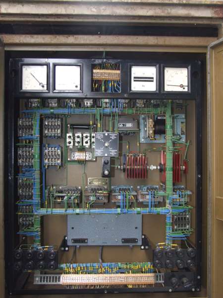 Hier der Schaltschrank von Innen. Auf der grauen Platte ist normalerweise der Audio-Verstärker (nächstes Bild) montiert