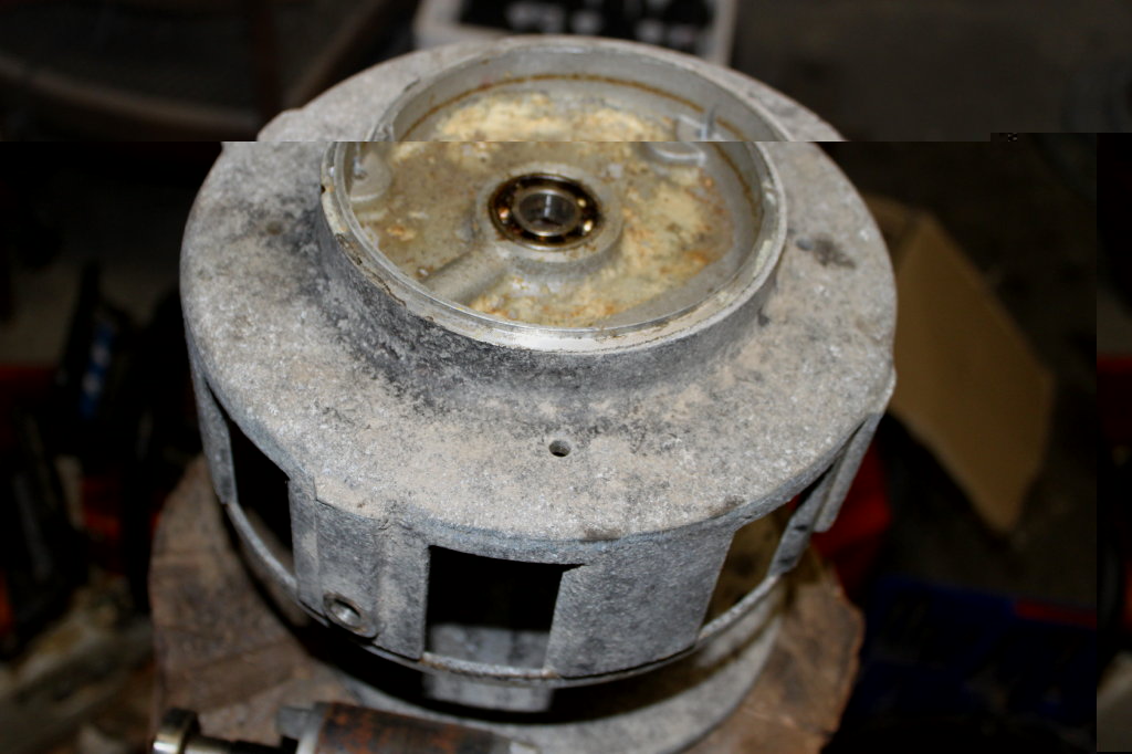 Der Restaurationsspaß hat schon angefangen. Die Dachbefestigungsbolzen und die Kabeltülle sind raus, der Ansaugdeckel ist runter, sogar der Rotor kam ohne Sperenzien, sprich ich konnte ihn mit der Hand abziehen. Interessant ist die Passfeder anstelle der obligatorischen Schraube, den Rotor kriegt man also immer wieder schön in die richtige Position zur Motorwelle. Dann die Ernüchterung, bei der Statorbefestigung kam unter antiker Spachtelmasse keine Schlitzschraube zum Vorschein. Im günstigsten Fall sind dann mal wieder bei allen 3 Verbindungen Schlitzmuttern darunter. Also: Zerlegung beendet. Ich mache sie schön sauber, verspachtele meine archäologische Grabung wieder und dann gibts Grundierung. Der Lauf der Lager ist durchaus brauchbar und ich will keinen irreparabelen Schaden durch übertriebene Restaurierungswut riskieren.