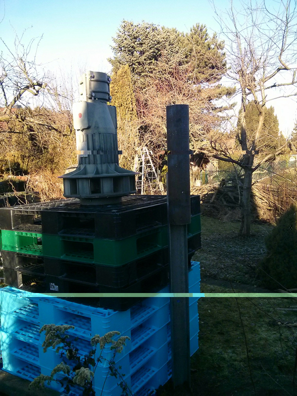 Um den Brocken in ca. 2 Meter Höhe auf den Mast zu bekommen haben wir neben dem Mast eine Plattform aus Paletten gestapelt. (Ist nicht so wackelig wie es aussieht...)