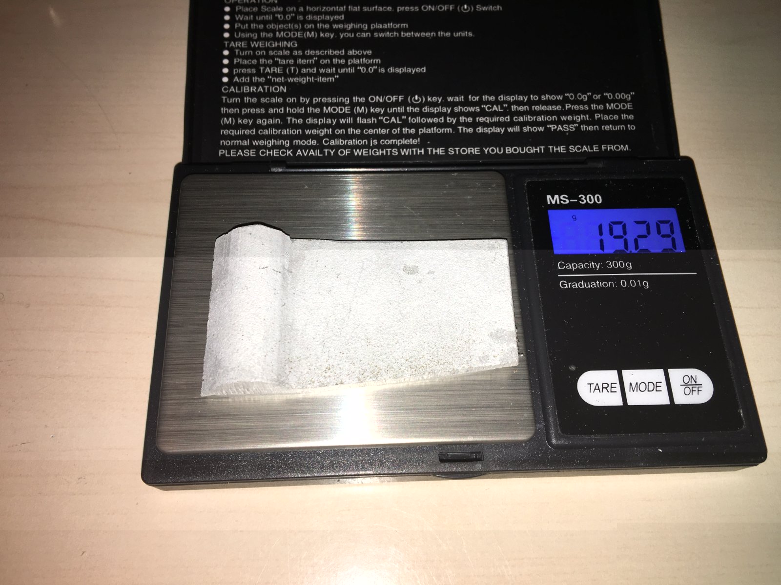 Gewicht vor dem Versuch: Gewicht nach dem Versuch: Wie man unschwer erkennen kann, hat sich das Gewicht um genau 10mg (Milligramm) verringert was eine Gewichtsreduktion von 0,5% entspricht. Also muss man festhalten das Ameisensäure DEFINITIV auch das Aluminium leicht anätzt und es abträgt. Allerdings ist der Abtrag m. E. nach sehr gering und vertretbar. Wirkliche Anzeichen einer Ätzung hat das Testteil eigentlich nicht außer das die Sägekanten etwas matter sind.