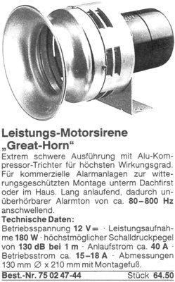 Zu dieser Sirene ist mir kein Hersteller bekannt. Sie wurde unter dem Namen "Great Horn" vekauft. Meine stammt ebenfalls vom Schrottplatz.