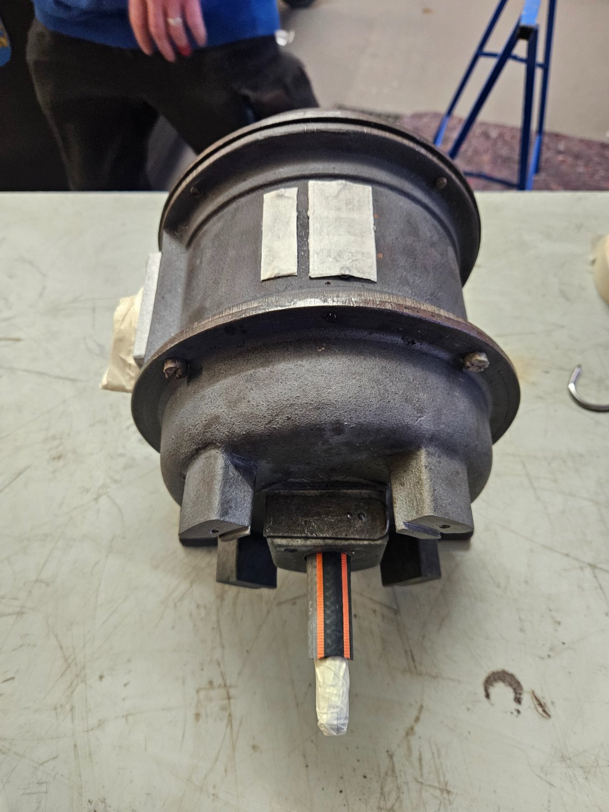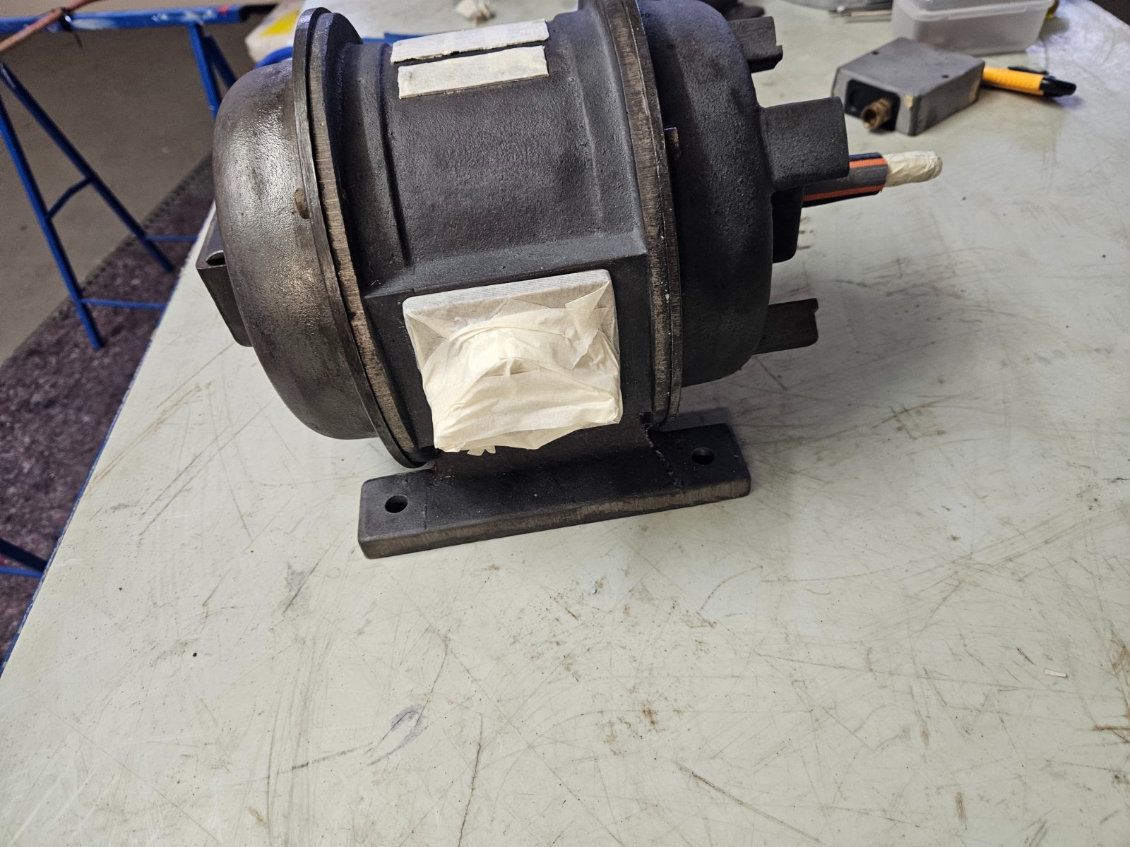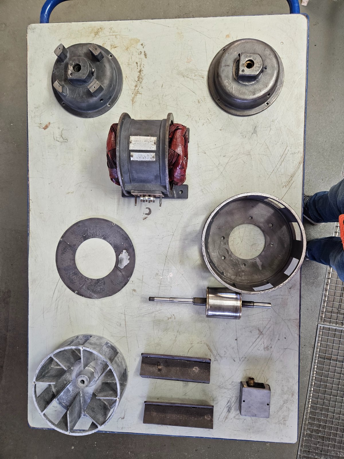Der Abbau ist geglückt - die Ziegelsteine waren "handwarm" abzunehmen, die Motorwelle dreht sich, der Rotor (nebst Schrauben) ließ sich ohne Kraft abziehen, die Schmieröffnungen gehen "flutschig" auf und laut ersten Messungen dürfte motortechnisch auch alles soweit OK sein... die Rotorabdeckung ist ein 4x am Rotor verschraubtes 1,5mm Blech...