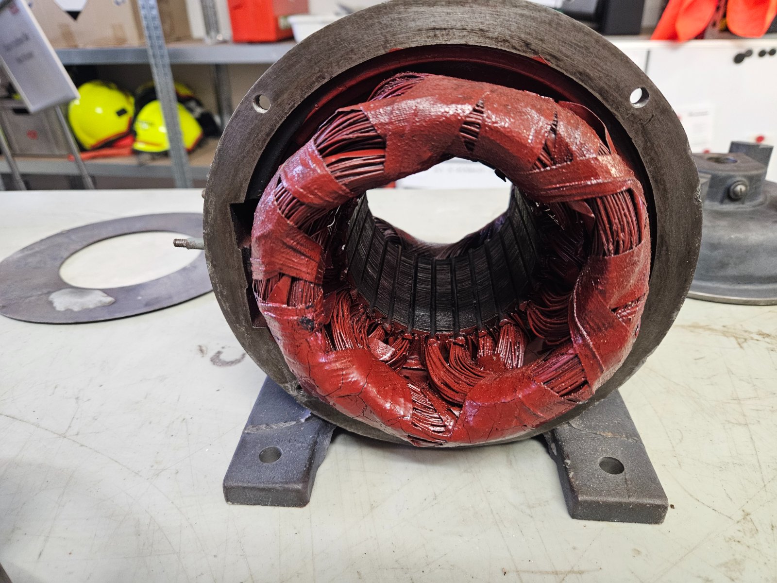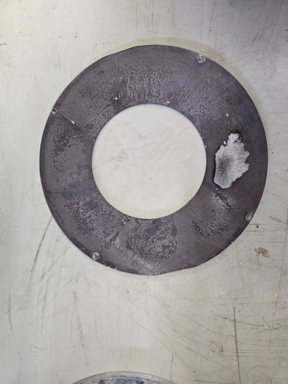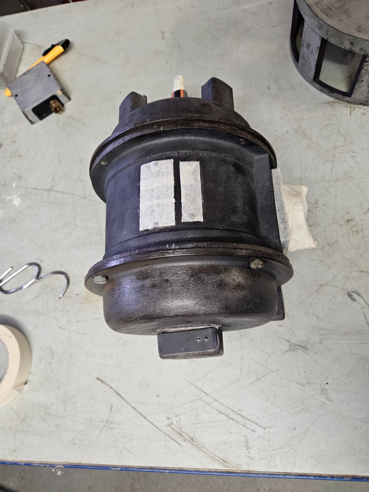 Der Abbau ist geglückt - die Ziegelsteine waren "handwarm" abzunehmen, die Motorwelle dreht sich, der Rotor (nebst Schrauben) ließ sich ohne Kraft abziehen, die Schmieröffnungen gehen "flutschig" auf und laut ersten Messungen dürfte motortechnisch auch alles soweit OK sein... die Rotorabdeckung ist ein 4x am Rotor verschraubtes 1,5mm Blech...