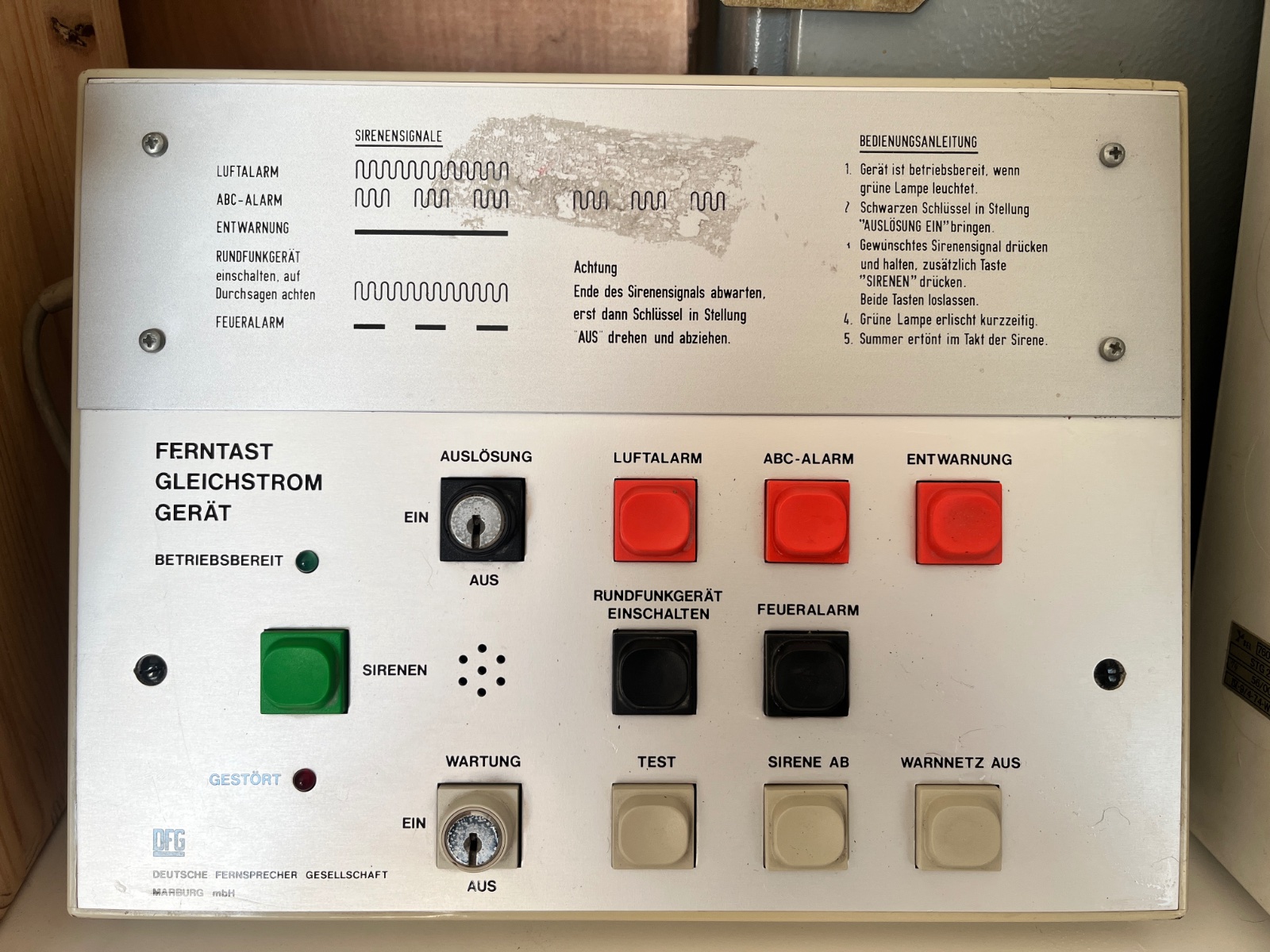 hm.....aber es wurden regional, bzw. es gab die Möglichkeit die Sirenen dezentral auszulösen ....in jeder Gemeinde hatten wir hier diese Geräte.....habs bei uns im Rathaus vor Jahren abgeschraubt .....h8ng ganz allein an der Wand, schön verkabelt....leider gabs in der Vermittlungsstelle der Stadt kein Gestell mehr....aber damit konnten Sie alle Sirenen in der Gemeinde auslösen
