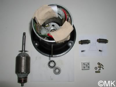 Die Halterungen für die Kohlebürsten habe ich auch noch ausgebaut, damit sie beim Lackieren später nicht im Weg sind. Die Feldspule zu entfernen war leider unmöglich, die sitzt zu fest im Sirenenfuß. Das folgende Foto zeigt die entnommenen Einzelteile des Motors.