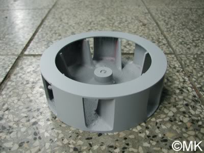 Der Rotor hatte mich sehr aufgehalten. Nachdem endlich die alte Farbe weitgehend runter war, konnte ich das Ding grundieren. Und man sieht immer noch rote Farbreste...
