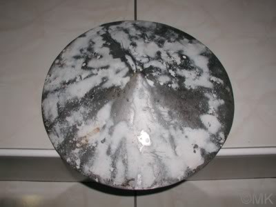 Die Lackschicht ist nicht mehr brauchbar. Der Vorbesitzer hatte die Sirene wohl schon einmal bearbeitet. Die bröselige Originallackschicht war einfach mit einer Farbe überstrichen worden. Diese seltsame Farbe war überhaupt nicht deckend, klebte und roch extrem vermodert. Sogar die Anschlussklemme aus Porzellan war liebevoll weiß angepinselt. Aber egal, einfach runter damit!