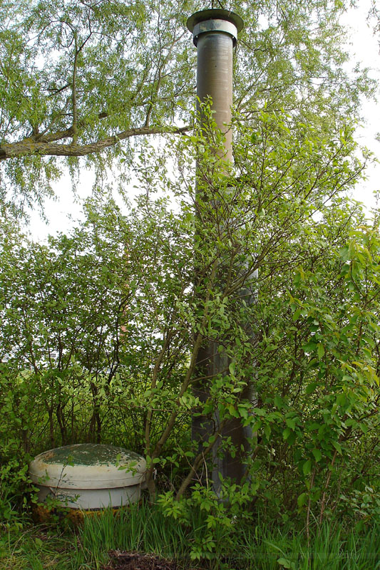 Mast ohne Kopf - In dem kleinen weißen Gebäude dahinter führt eine Treppe hinunter in einen Lagerraum. Dort schaut sogar noch der abgeschnittene Pressluftschlauch heraus, welcher zum Kopf führte!