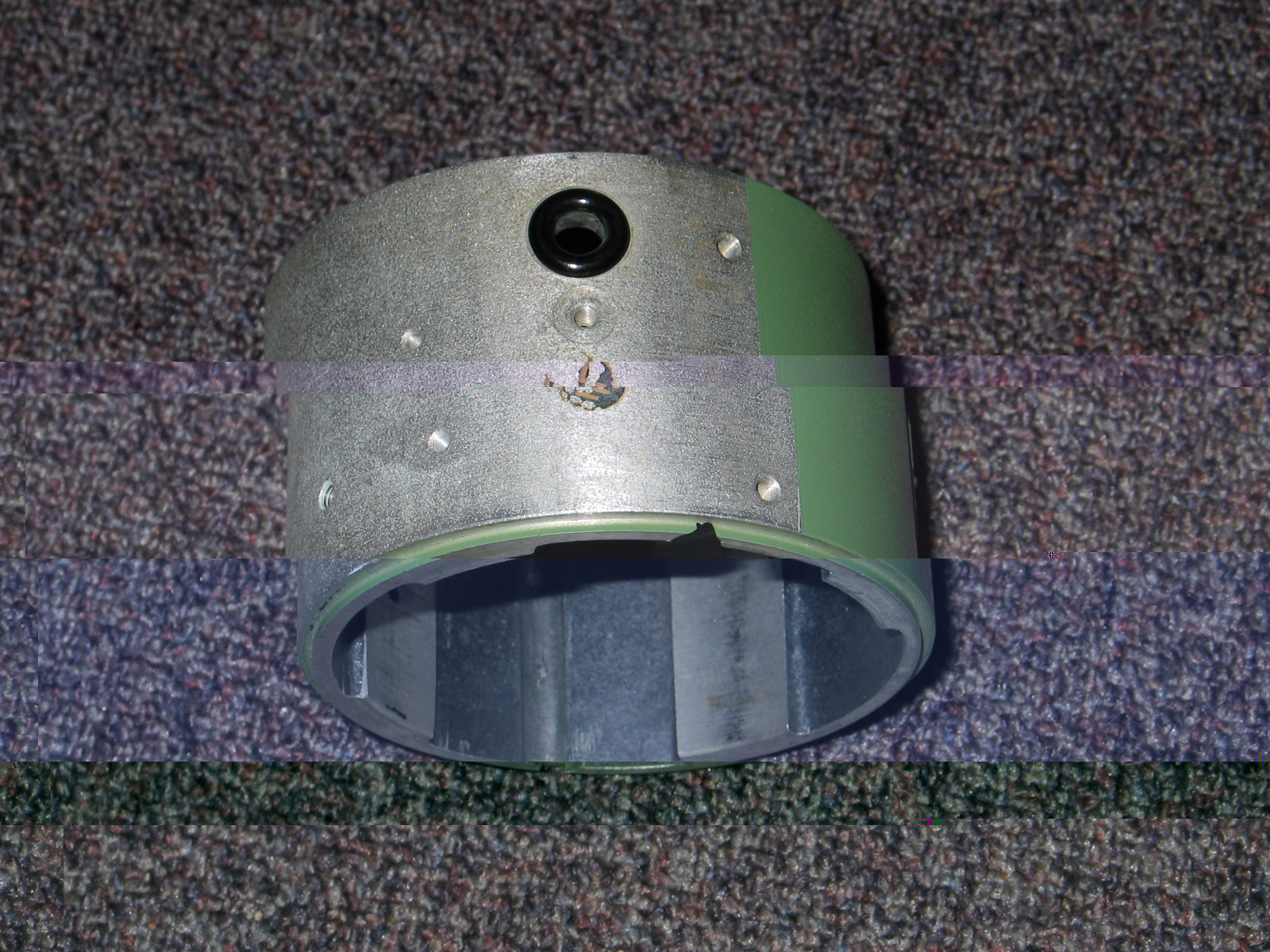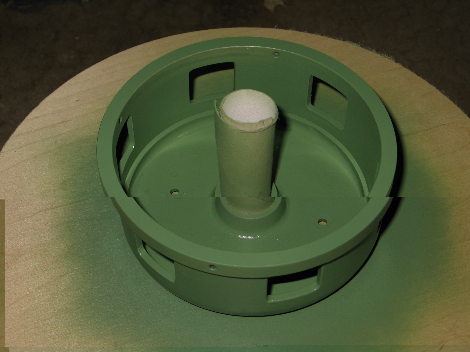 Die Farbe habe ich nicht 100% runter bekommen, aber ich habe das erste Teil nun mit Alu Grundierung besprüht und in RAL 6011 auf einem Drehteller bestehend aus MS20 Sierene, Kleberolle und Holzscheibe lackiert.