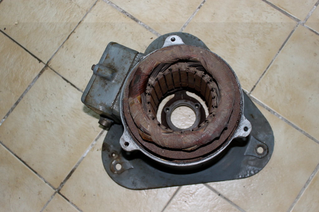 Für Graphit ist das Zeug verdammt hell, aber egal, unser Verkäufer und seine Kollegen haben die Teile gut gewartet. Die Schrauben der Motorabdeckung sahen auf den ersten Blick erbärmlich aus, sind dann aber förmlich rausgeflutscht ;-) Insgesamt irritiert mich die verdammt luftige Bauart. Oben die Plastikschüssel und sonst nichts über der Wicklung, durch die 400V marschieren, unten ist der Fuß nur durch die Isolierplatte einigermaßen abgedichtet. Die Motorstatorbleche sehen entsprechend aus. Auf den ersten Blick "indoor-use-only", aber irgendwie wird man sich was dabei gedacht haben.