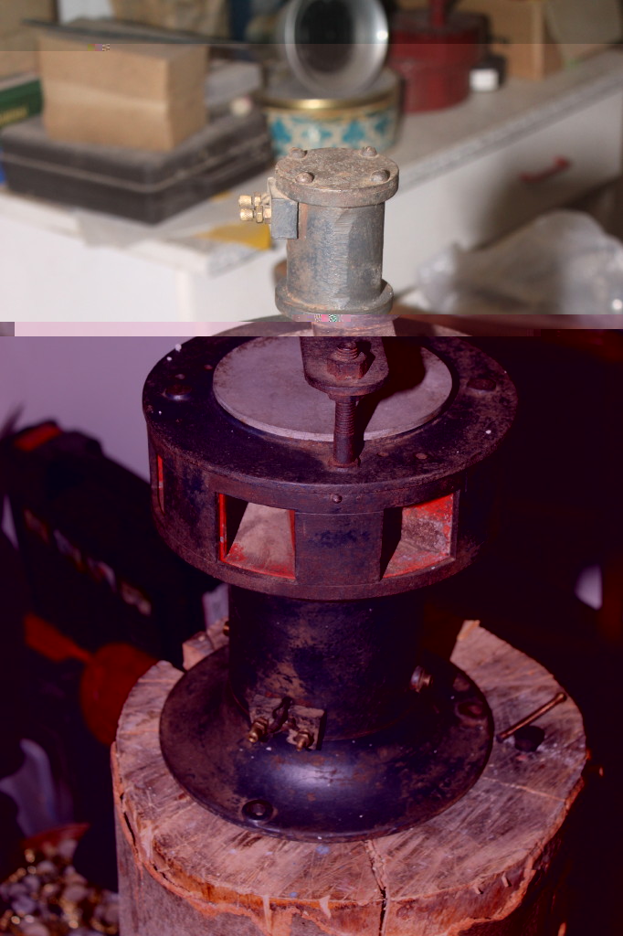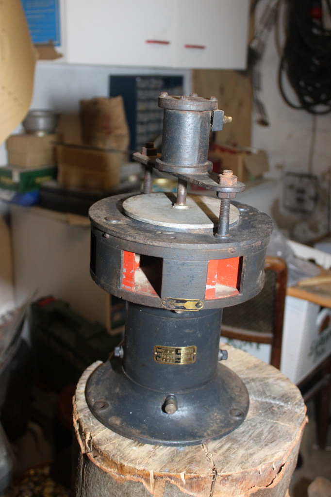 Jetzt aber zur Sirene, ist sicher auch fürs Wiki interessant, trotz unbekanntem Hersteller. Sie ist größer, als ich gedacht hatte. So zwischen S2 und S2a. AmTypenschild, schön aus Messing, sieht man ja schon, dass sie sehr alt sein muss, 1/5PS (109W). Sie stammt anscheinend aus einer Zeit, in der man noch sehr sorglos mit Elektrizität umgegangen ist, man erinnere sich an 220V-Modelleisenbahnen. Es ist auch nicht mal ansatzweise zu erkennen, dass über den blanken Klemmschrauben jemals Klemmkästen waren. Schutzleiteranschluß genauso - ?? Lt. Angabe des Verkäufers stammt sie aus einem Lagerhaus Bj. 1890. Vielleicht gehörte sie ja zur Erstausstattung. Die verbliebene Kohlebürste ist jedenfalls runter, also ist sie ausgiebig gelaufen. Neue Kohlebürsten + Kappen sind bestellt, Lieferzeit 3-4 Tage, vielleicht kann ich schon Samstag einen Probelauf machen. Einen Gehäuseschluß haben weder Morsemagnet noch Sirenenmotor, sie soll auch bis zum Abbau gelaufen sein.