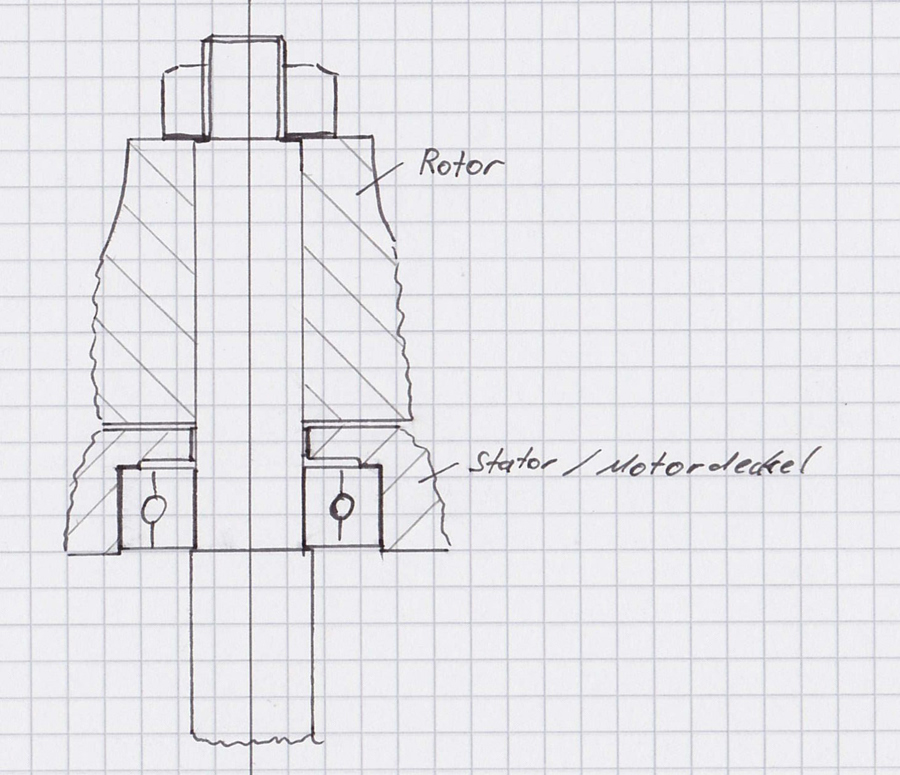Was mich nun aber wirklich stört ist, dass auf der Welle kein Absatz vorhanden ist, der für den Rotor als Anschlag dienen kann. Wenn man nun die Mutter bis zum ende des Gewindes auf der Welle anziehen wollte, würde man den Rotor auf den Stator pressen. – Nicht gut.
