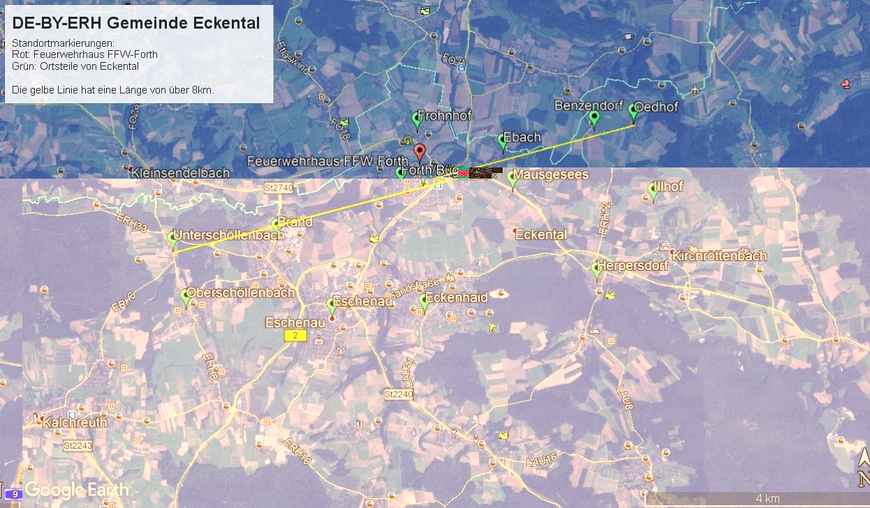 Es ist landesweiter Probealarm und die gefilmte Sirene ist die einzige, die zu hören ist... Die Gemeinde Eckental besteht aus 13 Einzelorten, die auf einer Fläche von 29,75km² verteilt sind (teilweise mit Höhenzügen und ausgedehnten Waldflächen dazwischen) und die Sirene in Forth ist in der ganzen Gemeinde die einzige, die Katastrophenalarm signalisieren kann. Forth liegt weder zentral, noch ist es bevölkerungsmäßig der größte Ortsteil. Ich habe das mittels Google-Earth mal in der angehängten Bilddatei optisch aufbereitet. Meiner Meinung nach ist da noch viel zu tun, wenn man einen akzeptablen Zustand herstellen will...