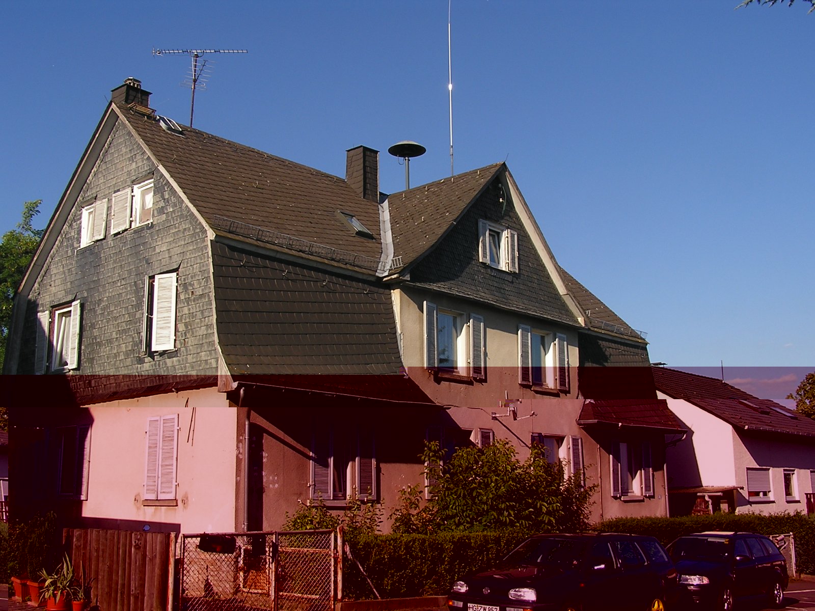 Den Anfang macht eine neue Sirene in Friedrichsdorf-Köppern (50°16'42.65"N, 8°38'55.84"E) als typische Mastmontage innerhalb einer städtichen Grünfläche im Schnittpunkt zweier Straßen. Bis vor gut 10 Jahren stand zwei Häuser weiter eine E 57 auf dem Dach des dortigen Hauses, das aber abgerissen und durch einen Neubau (auf dem Foto mit Wolkenhimmel im Hintergrund) ersetzt wurde. Es handelt sich um eine Ergatec EWS 6. Anhand einer mir zugespielten Handyaufnahme des ersten Tests kann ich immerhin sagen, dass sie einen ordentlichen Doppelton und normales Heulverhalten aufweist (nicht mehr so wie die ersten im Vordertaunus). Zum Vergleich noch das alte Haus und die Halterung offenbar für einen Feuermelder (auf dem Haus-Foto knapp über dem Dach des hinteren PKW erkennbar).