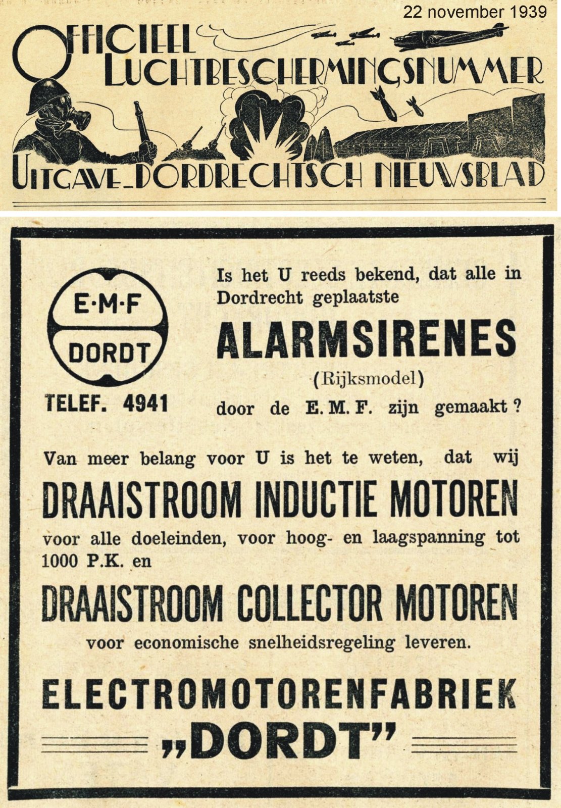 Dieser gewisse Sammler wäre ich. Tatsächlich wurder dieser Typ schon vor 1940 gebaut. Da dir das Typenschild fehlt, kann ich dir das nicht so leicht sagen. E.M.F Dordt war auf den Bau von Elektromotoren spezialisiert. Mit Beginn des 2. Weltkrieges erhöhte sich die Angst vor Bombenangriffe durch die Allierten. Die Regierung wollte so schnell wie möglich Luftschutzsirenen im ganzen Land installieren, jedoch war kaum etwas auf Lager. Die niederländische Industire sollte schnell mit der Herstellung von Sirenen beginnen und somit forderte sie zunächst das größte Elektrizitätsunternehmen der Niederlande mit dem Namen HEEMAF auf, zum Schutz der Bürger Luftschutzsirenen herzustellen. Währenddessen besaßen viele Fabriken sogenannte "Summer" für Pausen, die dann quasi zweckentfremdet und als Warnsirenen genutzt wurden. Neben HEEMAF gab es noch zwei andere Firmen, die ELektromotoren produziert haben - E.M.F Dordt und Smit Slikkverveer. Es war dann auch nicht verwunderlich, dass beide dann auch Luftschutzsirenen im Rahmen des 2. Weltkrieges bauten. Alle Unternehmen versuchten vom Krieg zu profitieren machten umfangreiche Anzeigen in den überregionalen Zeitungen für ihre Sirenenanlagen. Anbei eine Werbungsanzeige von E.M.F. Dordt für Sirenen im jahr 1939.