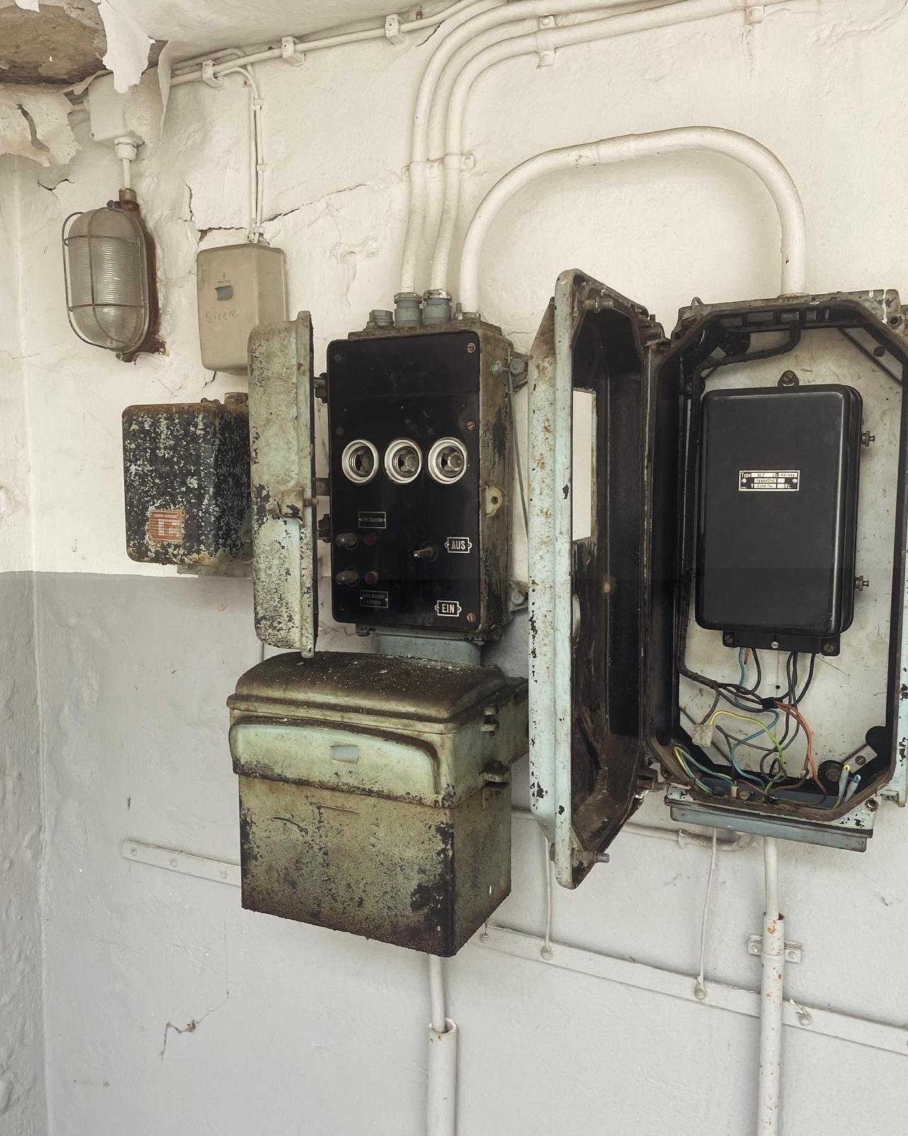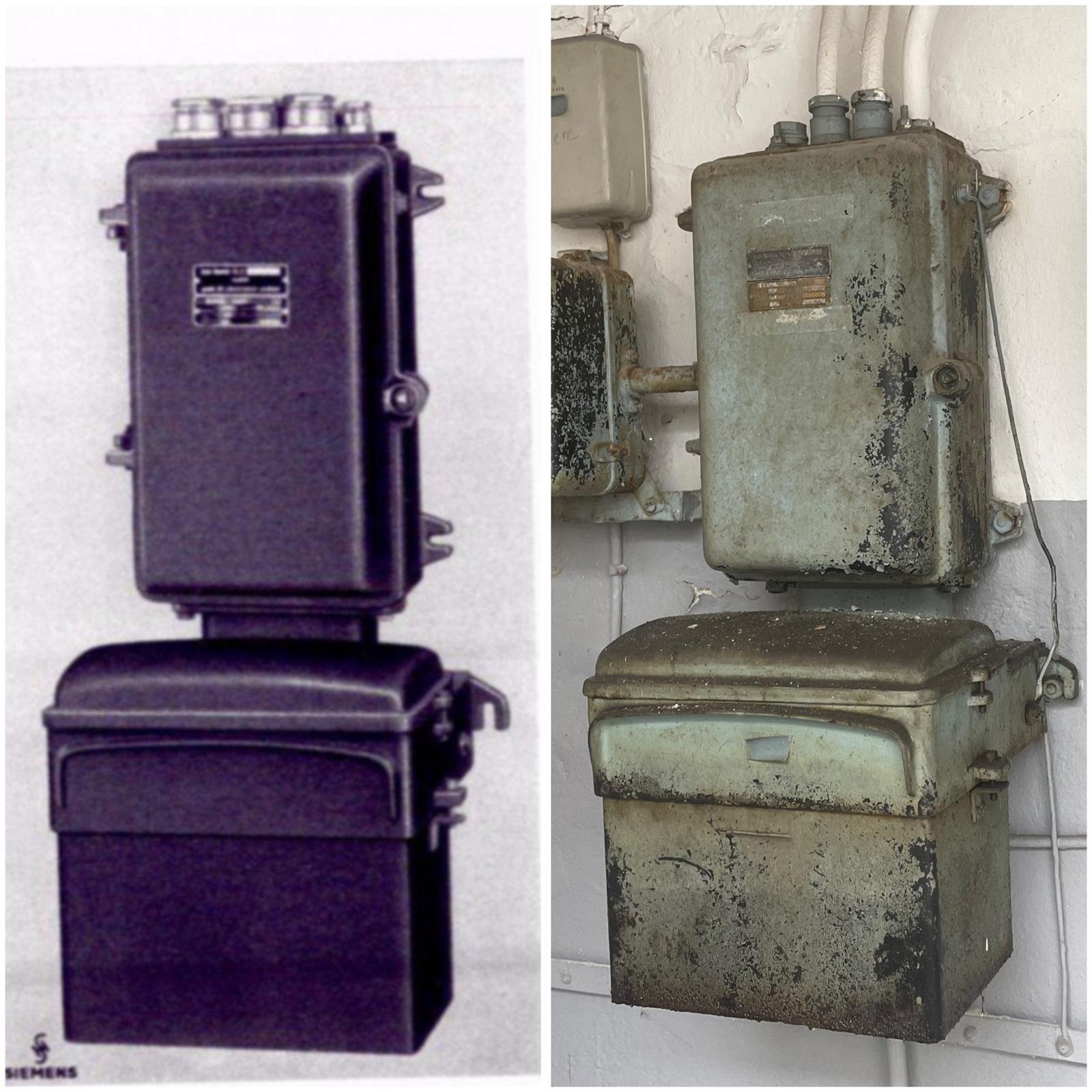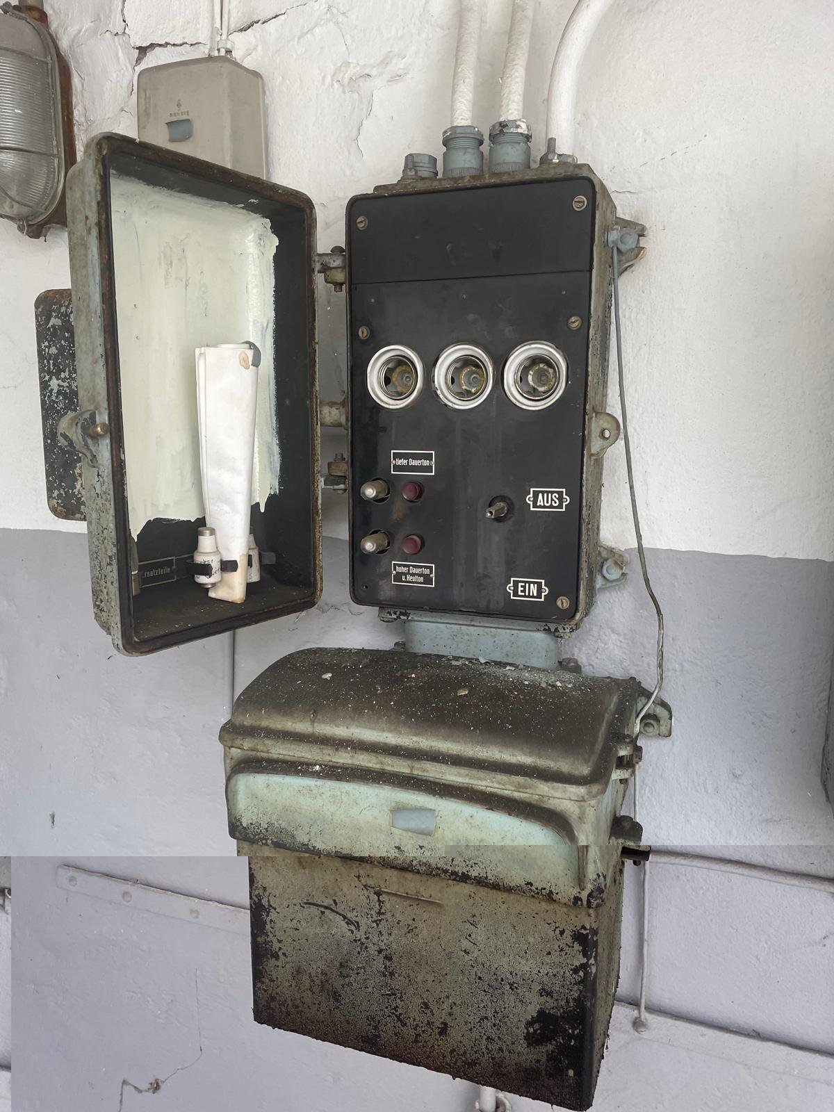 Meine größte Hoffnung wurde wahr! Die originale Schaltanlage war noch vorhanden und konnte von uns ebenfalls abgebaut und mitgenommen werden! Hierbei handelt es sich um den Doppelschaltkasten mit Ölschützen vom Typ S238a von Walther mit RL Abnahme (Nummer: RL 4-38/50; Baujahr 1939), einem Siemens Trafo um die Steuerspannung zu generieren (Typ EK 1,15), einem Siemens Quecksilberrelais (wahrscheinlich später nachgerüstet)und einem, in einen Gusskasten installiertes Taktsteuergerät (wahrscheinlich von Landis und Gyr, Typ: MZ Nr.401456), welches einen einminütigen Fliegeralarm taktet. Der Schalkasten ist in zeitgenössischen Katalogen sowohl für den Betrieb der FmSi40, alsauch der L1F2 von Elektror verzschrieben.