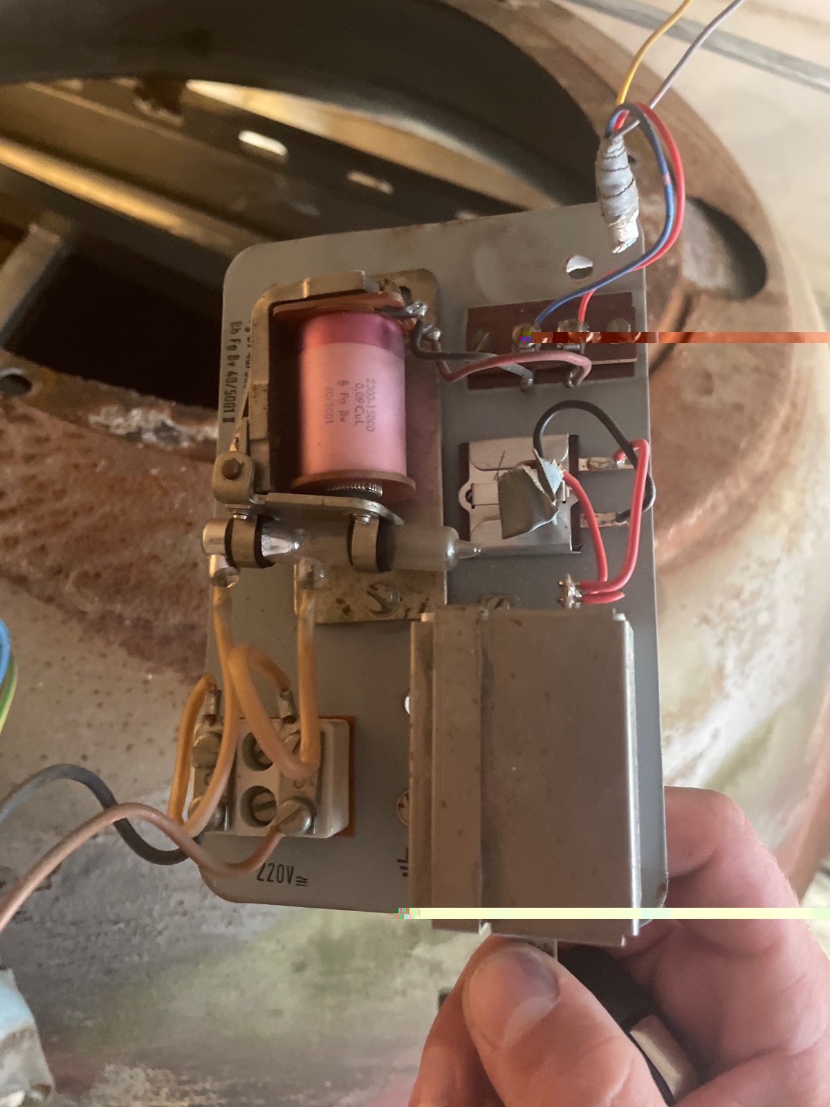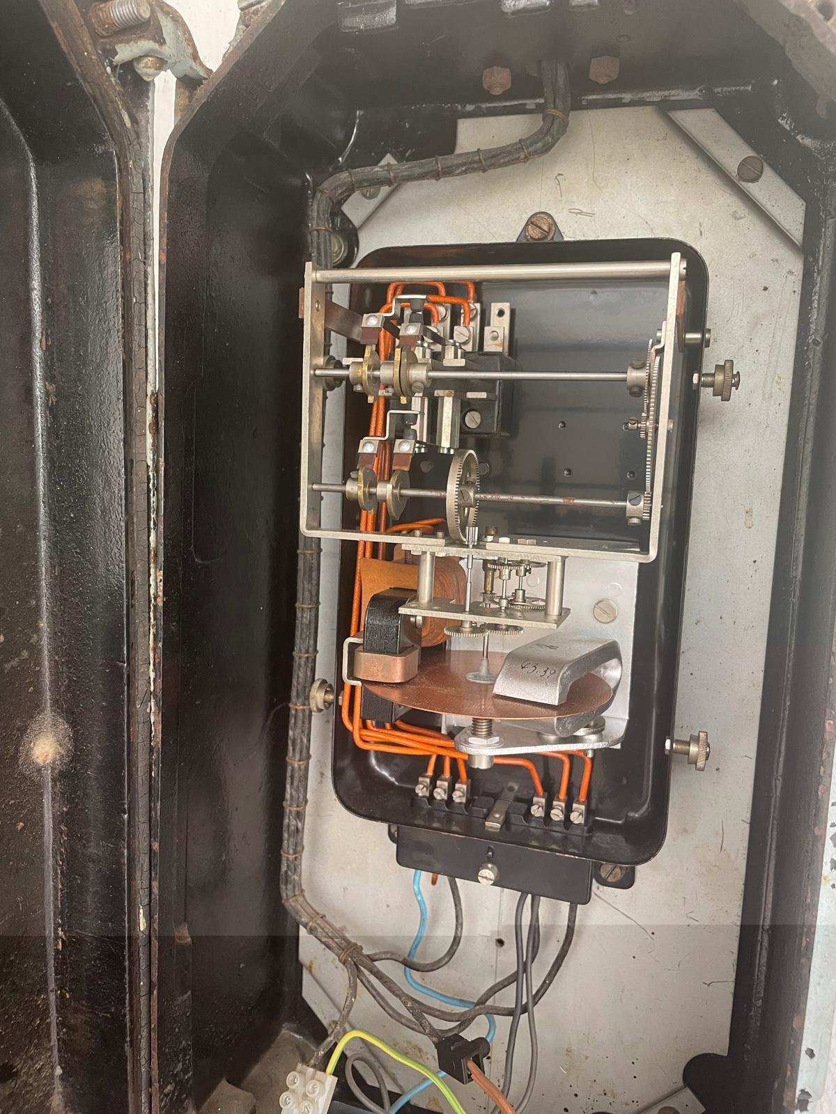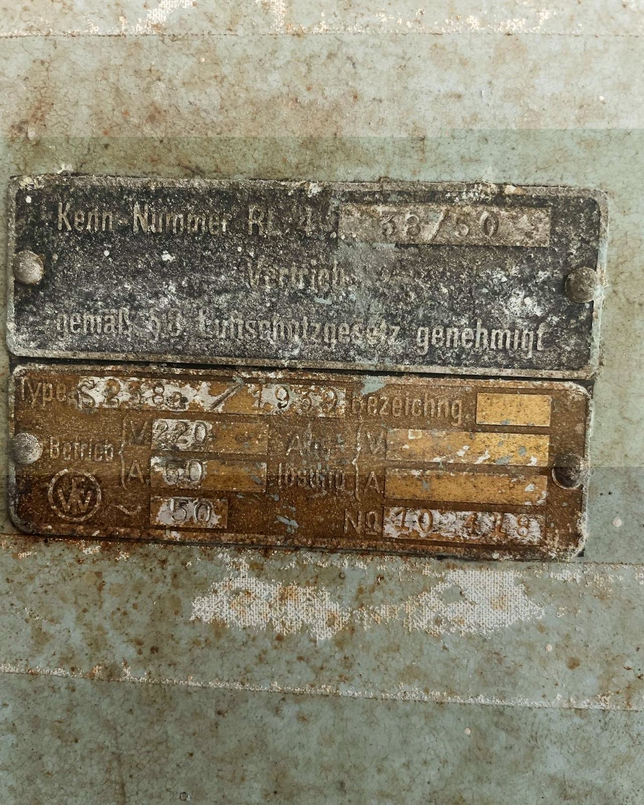 Meine größte Hoffnung wurde wahr! Die originale Schaltanlage war noch vorhanden und konnte von uns ebenfalls abgebaut und mitgenommen werden! Hierbei handelt es sich um den Doppelschaltkasten mit Ölschützen vom Typ S238a von Walther mit RL Abnahme (Nummer: RL 4-38/50; Baujahr 1939), einem Siemens Trafo um die Steuerspannung zu generieren (Typ EK 1,15), einem Siemens Quecksilberrelais (wahrscheinlich später nachgerüstet)und einem, in einen Gusskasten installiertes Taktsteuergerät (wahrscheinlich von Landis und Gyr, Typ: MZ Nr.401456), welches einen einminütigen Fliegeralarm taktet. Der Schalkasten ist in zeitgenössischen Katalogen sowohl für den Betrieb der FmSi40, alsauch der L1F2 von Elektror verzschrieben.