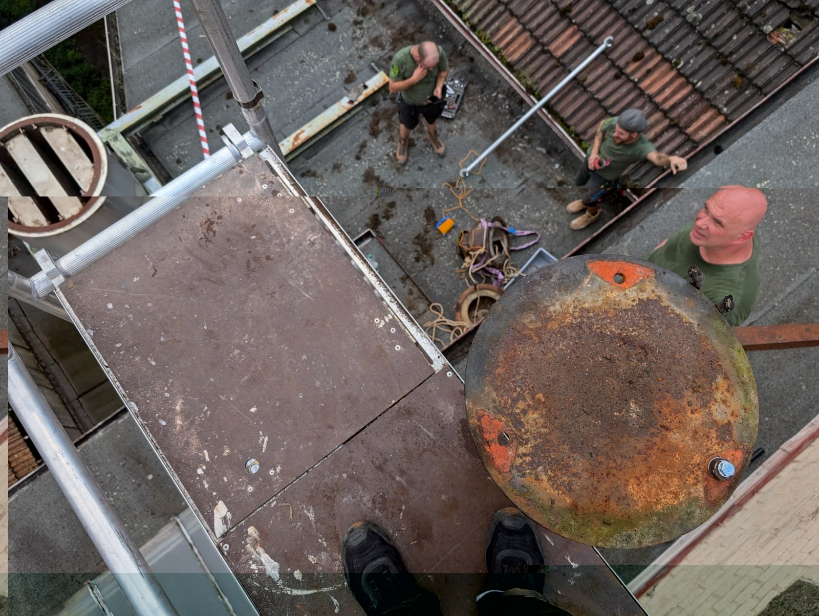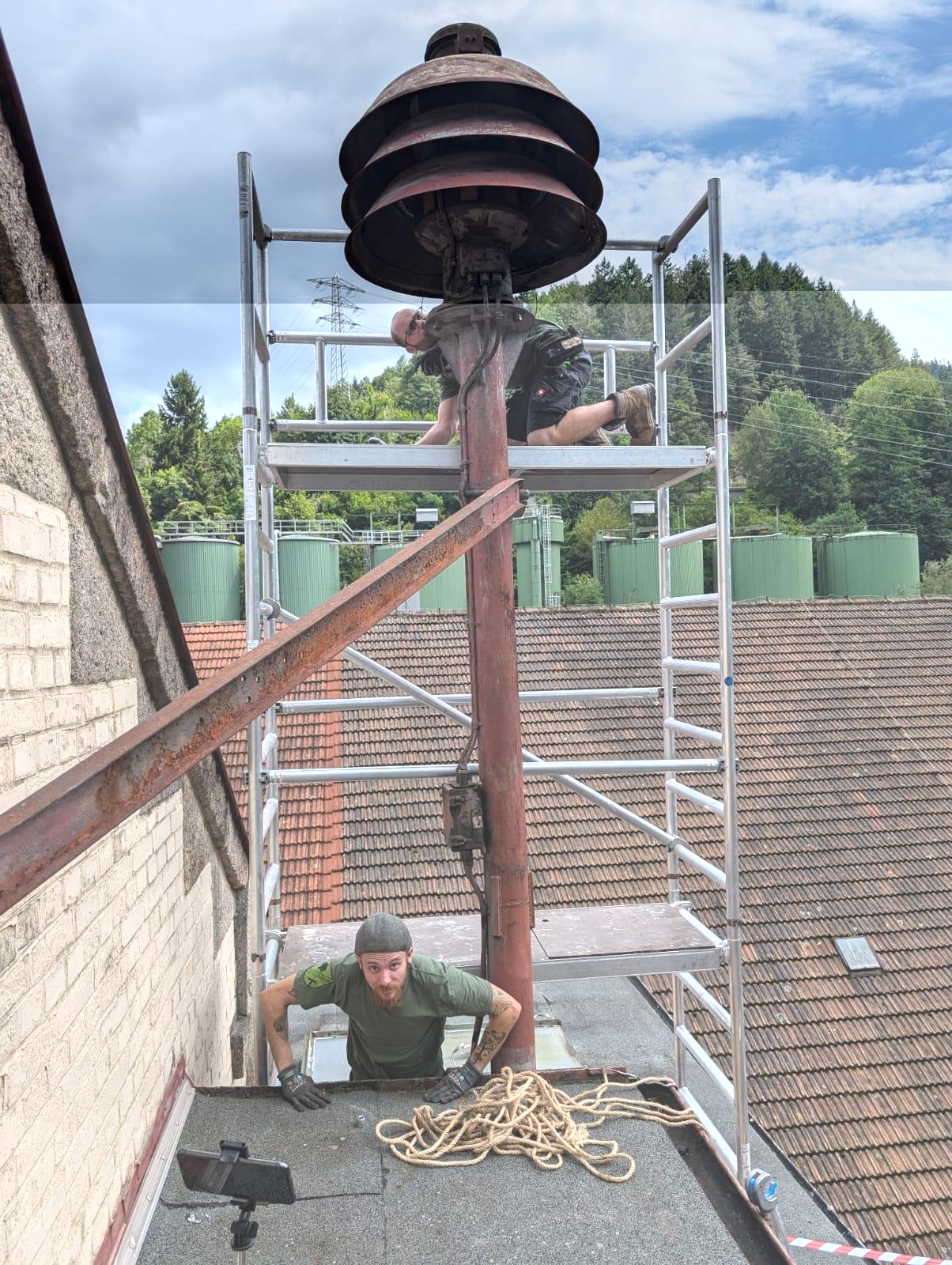 Nach diesem schönen Fund ging es schon ans Gerüstaufbauen, was bei schwülem Wetter sehr schweißtreibend war. Als das Gerüst stand, wurden erst die drei Schutzdächer, dann der Tieftöner und zu guterletzt der Hochtöner demontiert und an einem Strick abgelassen. Nach dem alle Teile vom Mast geholt waren, durften wir diese und die Gerüstteile natürlich wieder drei Stockwerke durch das Treppenhaus schleppen. Zum schluss wurde noch die Schaltanlage demontiert und etwas im Lostplace herumgestöbert.