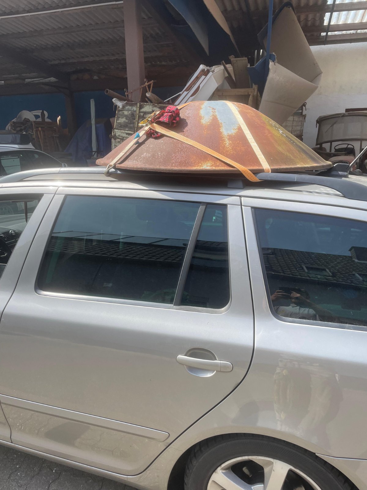 Nun konnte ich das Schutzdach abschrauben (Alle vier schrauben ließen sich zum Glück auch ohne Flex entfernen) und mit einem Strick vom Dach an der Hauswand abseilen. Danach ging es an die Sirene. Deren drei Befestigungsschrauben wollten leider entgegen meiner Erwartungen nicht so, wie ich es wollte. Also fielen sie der Flex zum Opfer. Die Sirene sicherte ich mit einem Strick und nutzte den Mastkopf als Umlenkrolle um sie abzuseilen. Unterm Dach hielten die Jungs das Seil und gaben es langsam nach, während ich die Sirene richtung Dachfenster führte. Nachdem sie dann sicher auf dem Dachboden angekommen war, demontierte ich noch den Mastkopf, da dieser ein Originalstück von Elektror war (Elektror hat für die S4A einfach E57 Mastköpfe in die passende Form geschnitten). Den nun offenen Mast habe ich dann mt einer passenden Verschlusskappe abgedichtet. Jetzt konnte das ganze Gerümpel ans Auto getragen und verladen werden. Das Schutzdach passte leider nicht mehr rein und musste aufs Dach geschnallt werden.