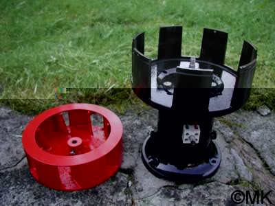 Der inzwischen lackierte Rotor liegt bereit zum Einbau in den Stator. Lackiert hab ich ihn übrigens nur außen mit Sprühlack. Innen ist er mit dem gleichen Farbton (RAL 3000) angepinselt – da wäre ich mit der Sprayflasche allein nicht an alle Stellen gekommen, oder es hätte außen dann Lacknasen gegeben.
