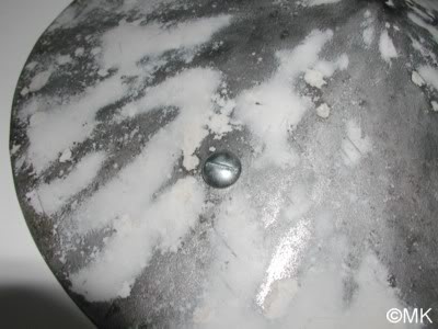 Die Lackschicht ist nicht mehr brauchbar. Der Vorbesitzer hatte die Sirene wohl schon einmal bearbeitet. Die bröselige Originallackschicht war einfach mit einer Farbe überstrichen worden. Diese seltsame Farbe war überhaupt nicht deckend, klebte und roch extrem vermodert. Sogar die Anschlussklemme aus Porzellan war liebevoll weiß angepinselt. Aber egal, einfach runter damit!