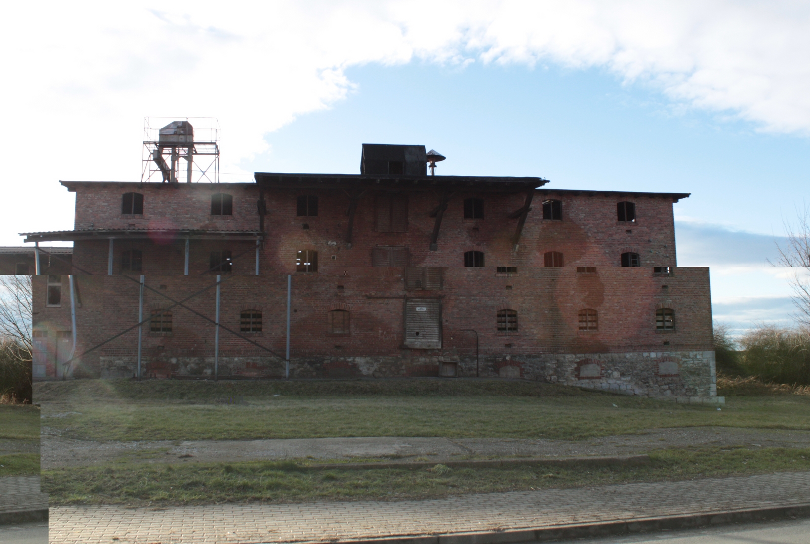 Naja, das Gebäude sieht von der anderen Seite noch schlimmer aus. Ist fast halb eingestürzt. Die Türen sind zu, ich weiß nicht, ob das wirklich sicher ist. Könnte mir nur vorstellen, dass man mit einer Leiter heran könnte. Aber ob das so legal ist...?