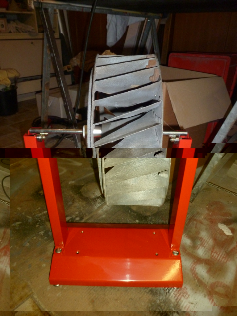 Als erstes musste ein Wuchtbock her da ich den starken Verdacht hatte dass der Lüfter unwuchtig ist. Mein Verdacht war ein Volltreffer, aber nach läppischen 2 Stunden Gewichte wegschrauben - Gewichte dranschrauben zuwenig oder zuviel wieder weg usw. usw. bleibt er jetzt in jeder Stellung stehen - will heißen er ist ausgewuchtet.