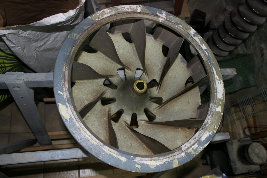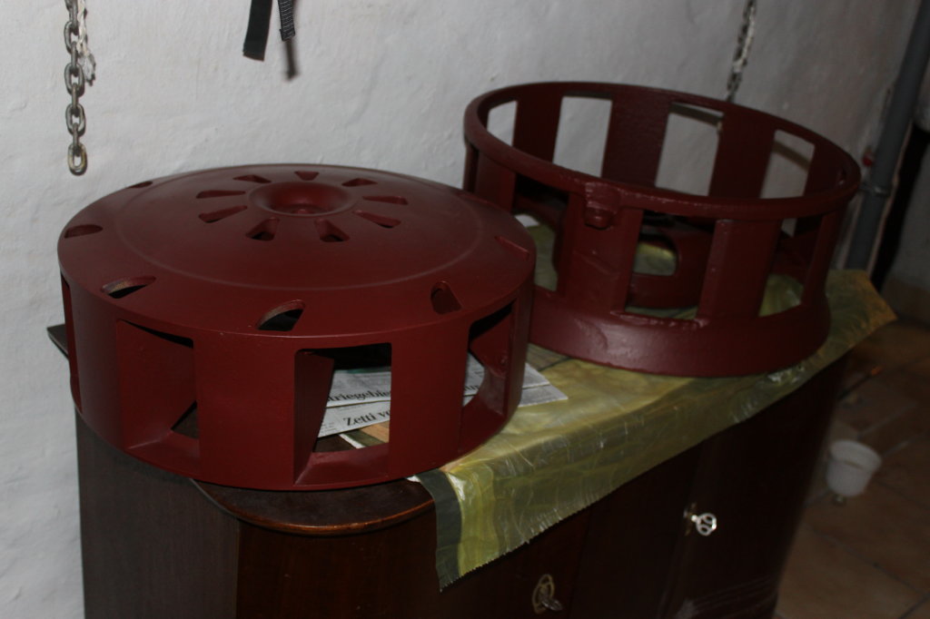 In den letzten Tagen hab ich die "Großbauteile" Rotor, Stator und Motorgehäuse entrostet und grundiert. Nun haben alle die vorläufige Farbe Rostschutzgrundbraun. Apropos Farbe, freundlicherweise erhielt ich den Hinweis, dass es eine schwarz-gelbe E57 hier schon gibt. Also hab ich zusammen mit meiner Frau ein neues Farbkonzept erstellt. Die Außenhülle wird blau, der Rotor zweifarbig ;-)