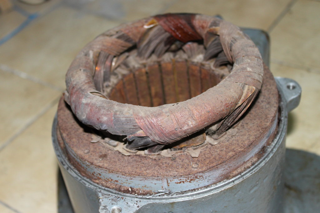 Für Graphit ist das Zeug verdammt hell, aber egal, unser Verkäufer und seine Kollegen haben die Teile gut gewartet. Die Schrauben der Motorabdeckung sahen auf den ersten Blick erbärmlich aus, sind dann aber förmlich rausgeflutscht ;-) Insgesamt irritiert mich die verdammt luftige Bauart. Oben die Plastikschüssel und sonst nichts über der Wicklung, durch die 400V marschieren, unten ist der Fuß nur durch die Isolierplatte einigermaßen abgedichtet. Die Motorstatorbleche sehen entsprechend aus. Auf den ersten Blick "indoor-use-only", aber irgendwie wird man sich was dabei gedacht haben.