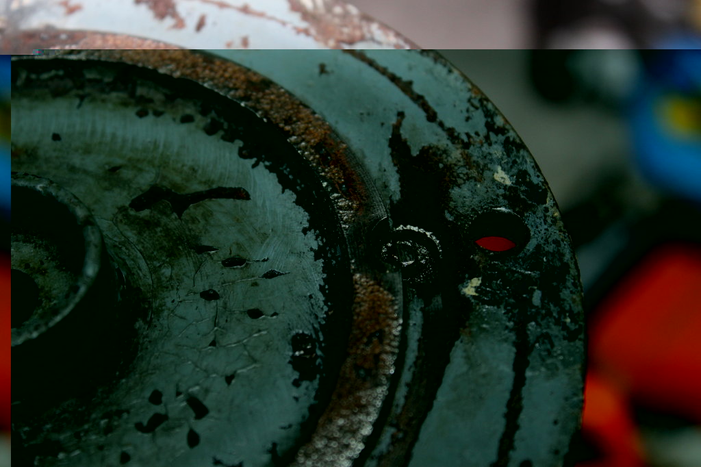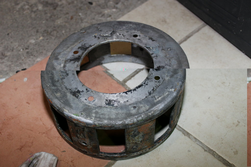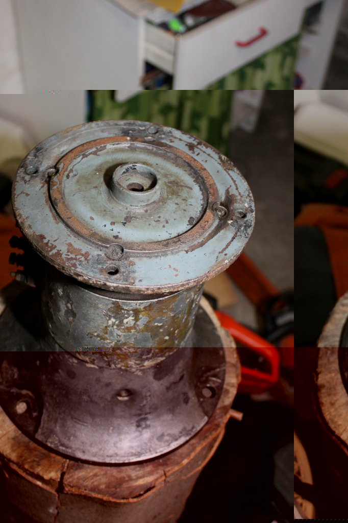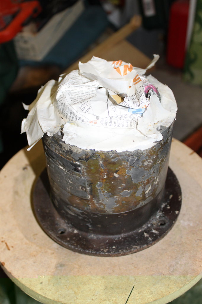 Heute sind wieder einige Sachen passiert, die Uraltniete sind raus, der Deckel ist geklebt und ich hab entgegen meiner früheren Einstellung doch erstmal den Stator vom oberen Lagerschild abgebaut. Nach dem Lösen der 4 Schlitzschrauben, nur die Letzte hat wie immer Probleme gemacht, saß er zunächst bombenfest. Als ich nach einer WD40-Einweichphase den Abzieher gaaaaanz vorsichtig angezogen hab kam er mit einem Knall und mir rutschte das Herz in die Hose. Aber es war gotteseidank nur der Uraltrostschmadder, der Stator hats überlebt. Jetzt nach der Reinigung kann ich ihn jederzeit wieder unterstellen oder die Gewindebohrungen doch an meiner Bohrmaschine vertiefen. Eine durchwachsene Überraschung sind die anscheinend vernieteten Stehbolzen des oberen Lagerschilds. Die bohre ich nun nicht auch noch aus, zumal die Sache prima hält. Muss ich nur schauen, wie ich so ein paar Rostbrocken von den Motorstatorblechen gekratzt kriege, die haben mir die Riefen in die Motorwelle gemacht.